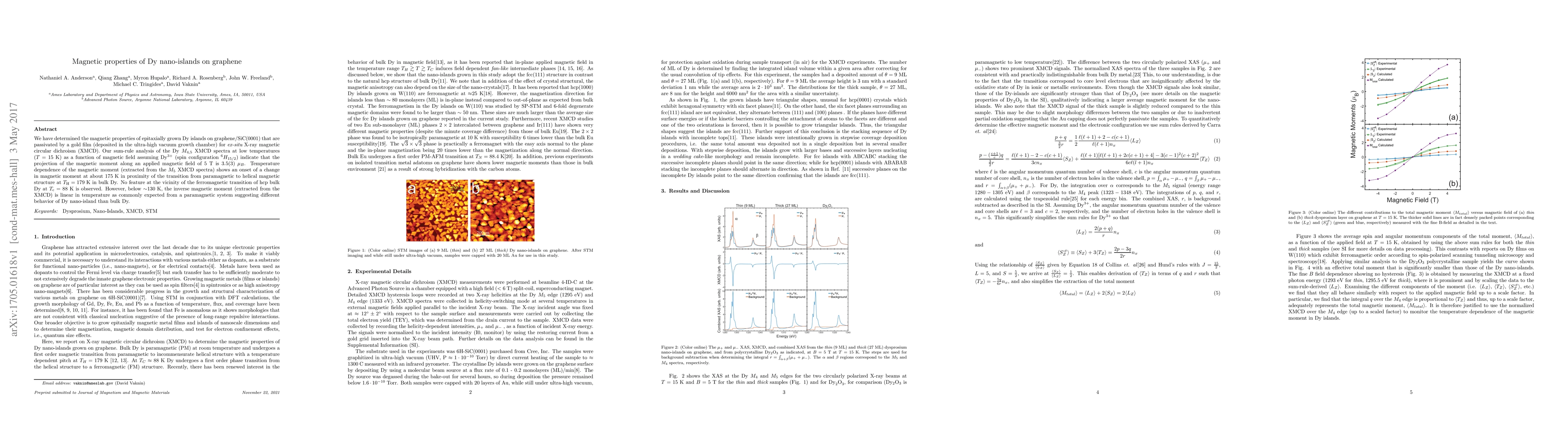 We have determined the magnetic properties of epitaxially grown Dy islands on graphene/SiC(0001) that are passivated by a gold film (deposited in the ultra-high vacuum growth chamber) for {\it ex-situ} X-ray magnetic circular dichroism (XMCD). Our sum-rule analysis of the Dy $M_{4,5}$ XMCD spectra at low temperatures ($T=15$ K) as a function of magnetic field assuming Dy$^{3+}$ (spin configuration $^6H_{15/2}$) indicate that the projection of the magnetic moment along an applied magnetic field of 5 T is 3.5(3) $\mu_B$. Temperature dependence of the magnetic moment (extracted from the $M_5$ XMCD spectra) shows an onset of a change in magnetic moment at about 175 K in proximity of the transition from paramagnetic to helical magnetic structure at $T_{\rm H} =179$ K in bulk Dy. No feature at the vicinity of the ferromagnetic transition of hcp bulk Dy at $T_{\rm c}$ = 88 K is observed. However, below $\sim$130 K, the inverse magnetic moment (extracted from the XMCD) is linear in temperature as commonly expected from a paramagnetic system suggesting different behavior of Dy nano-island than bulk Dy.
