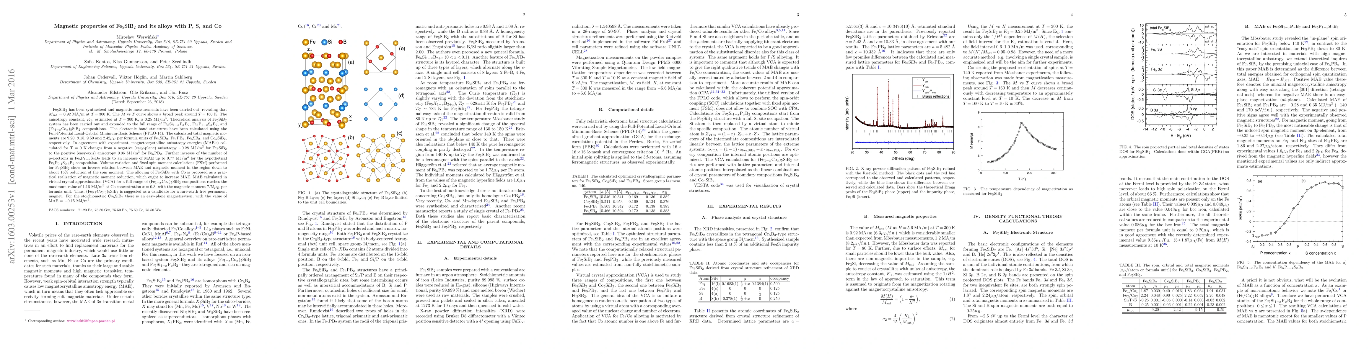 Fe$_5$SiB$_2$ exhibits magnetic saturation of 0.92 MA/m at 300 K and a broad magnetic peak around 160 K. Theoretical analysis of Fe$_5$SiB$_2$ and its alloys with P, S, and Co shows that alloying with Co can significantly enhance magnetocrystalline anisotropy, suggesting (Fe$_{0.7}$Co$_{0.3}$)$_5$SiB$_2$ as a potential rare-earth free permanent magnet.