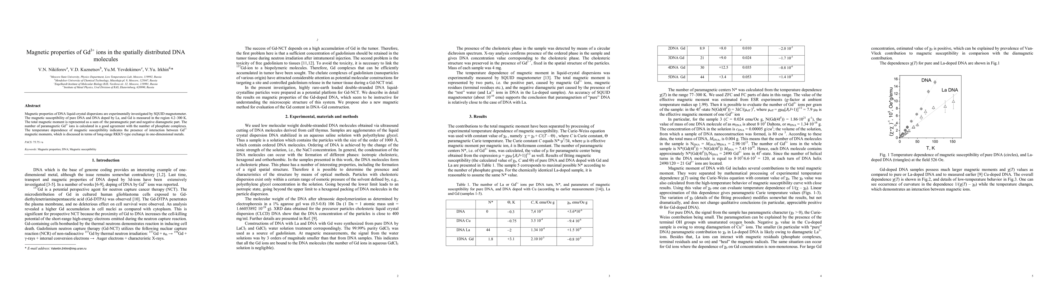Magnetic properties of DNA liquid-crystal dispersions are experimentally investigated by SQUID magnetometer. The magnetic susceptibility of pure DNA and DNA doped by La, and Gd is measured in the region 4.2-300 K. The total magnetic moment is represented as a sum of: the paramagnetic part and negative diamagnetic part. The number of paramagnetic Gd3+ ions is calculated in a good agreement with the number of phosphate complexes. The temperature dependence of magnetic susceptibility indicates the presence of interaction between Gd3+ magnetic moments, which is discussed in terms of long-range RKKY-type exchange in one-dimensional metals.