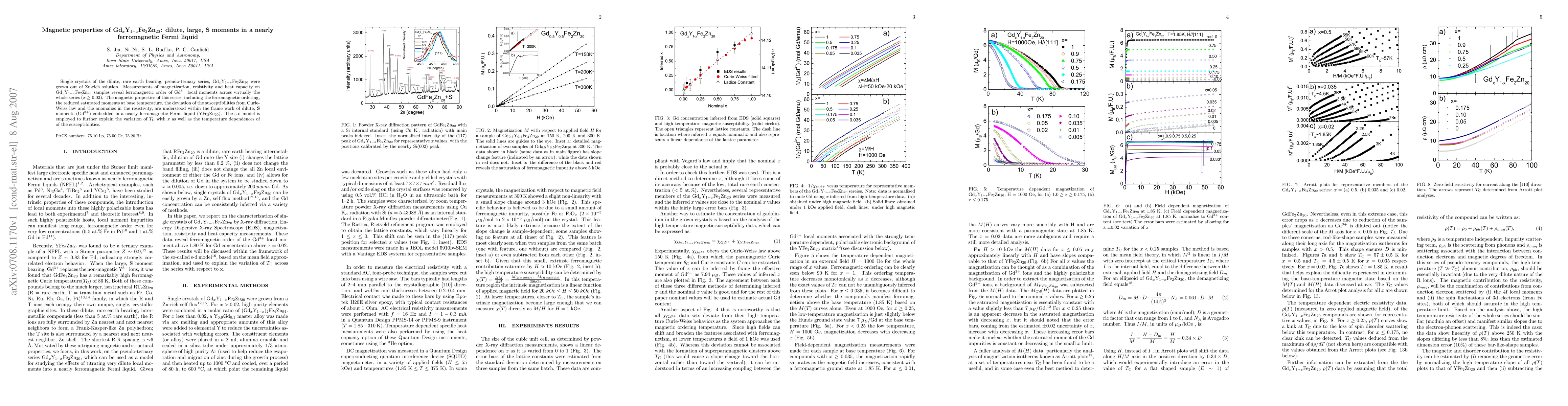 This paper investigates the magnetic properties of Gd_xY_{1-x}Fe_2Zn_{20} single crystals, revealing ferromagnetic order from Gd^{3+} moments across the series. The study explains these properties using a framework of dilute S moments in a nearly ferromagnetic Fermi liquid, employing the s-d model to understand temperature dependencies and critical temperatures.