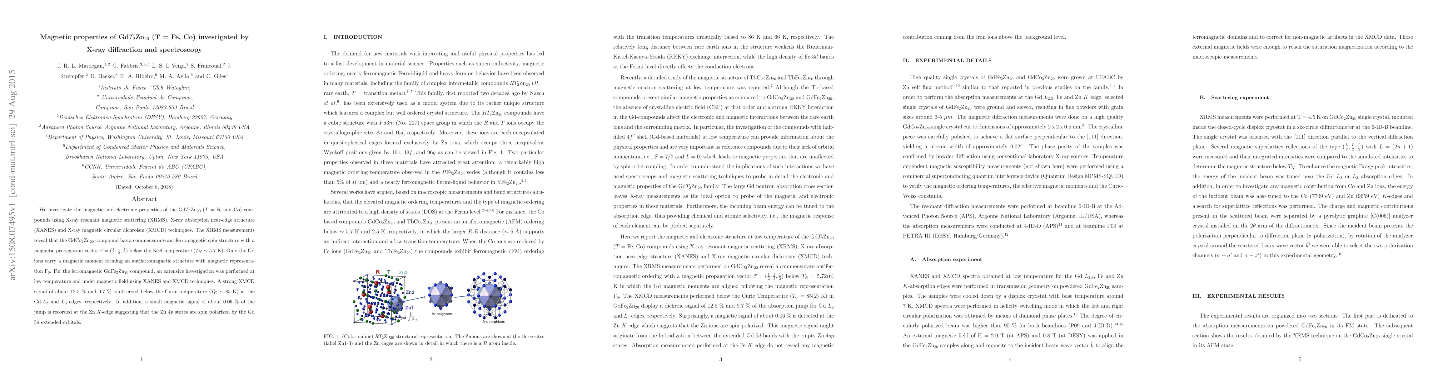 This paper investigates the magnetic properties of Gd$T_2$Zn$_{20}$ (T = Fe, Co) using X-ray diffraction and spectroscopy techniques. GdCo$_2$Zn$_{20}$ exhibits a commensurate antiferromagnetic spin structure, while GdFe$_2$Zn$_{20}$ shows ferromagnetic behavior with a strong XMCD signal and spin polarization of Zn 4$p$ states by Gd 5$d$ orbitals.