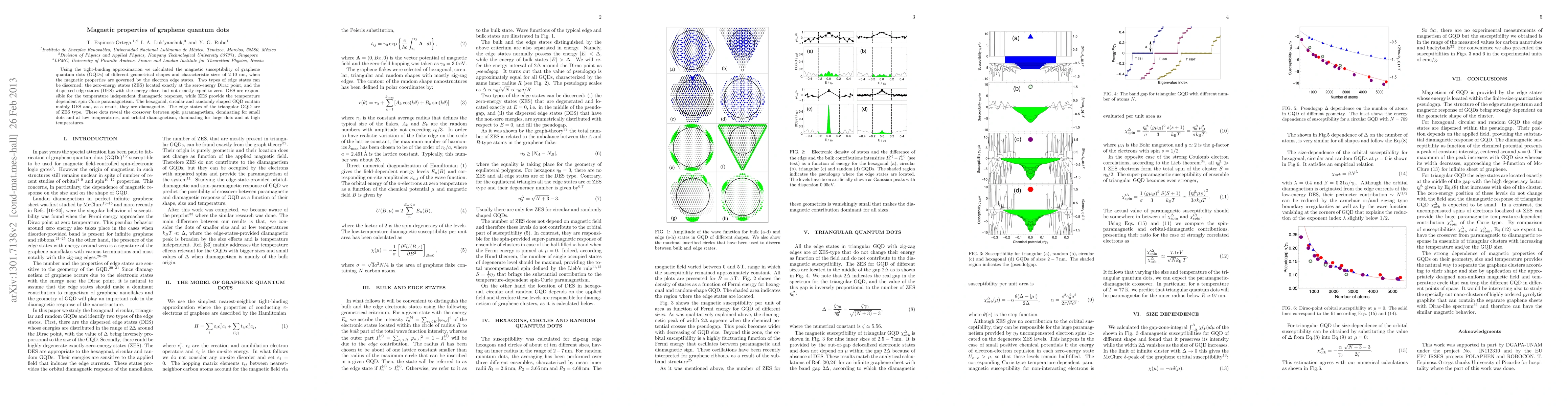 This study investigates the magnetic susceptibility of graphene quantum dots (GQD) using tight-binding approximation, revealing that the type and size of GQDs determine their magnetic behavior through edge states. Triangular GQDs with zero-energy states exhibit temperature-dependent spin paramagnetism, while hexagonal, circular, and randomly shaped GQDs dominated by dispersed edge states show temperature-independent diamagnetism.