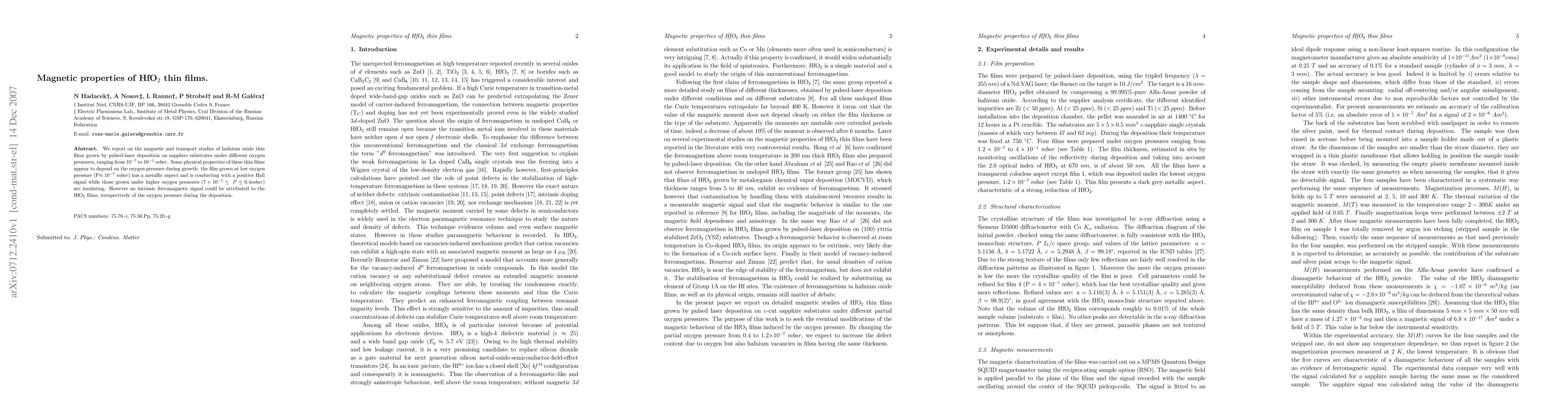 Hafnium oxide (HfO2) thin films were prepared using pulsed-laser deposition on c-sapphire substrates under varying oxygen pressures (10-7 to 10-1 mbar). Magnetic and transport properties were studied using SQUID magnetometry and Hall measurements.