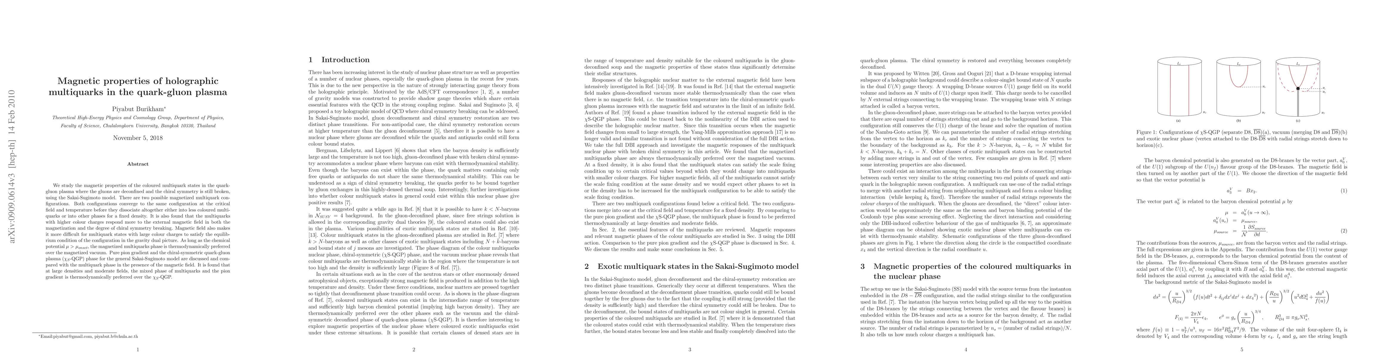 We study the magnetic properties of the coloured multiquark states in the quark-gluon plasma where the gluons are deconfined and the chiral symmetry is still broken, using the Sakai-Sugimoto model. There are two possible magnetized multiquark configurations. Both configurations converge to the same configuration at the critical field and temperature before they dissociate altogether either into less coloured multiquarks or into other phases for a fixed density. It is also found that the multiquarks with higher colour charges respond more to the external magnetic field in both the magnetization and the degree of chiral symmetry breaking. Magnetic field also makes it more difficult for multiquark states with large colour charges to satisfy the equilibrium condition of the configuration in the gravity dual picture. As long as the chemical potential $\mu > \mu_{onset}$, the magnetized multiquarks phase is thermodynamically preferred over the magnetized vacuum. Pure pion gradient and the chiral-symmetric quark-gluon plasma ($\chi_S$-QGP) phase for the general Sakai-Sugimoto model are discussed and compared with the multiquark phase in the presence of the magnetic field. It is found that at large densities and moderate fields, the mixed phase of multiquarks and the pion gradient is thermodynamically preferred over the $\chi_S$-QGP.