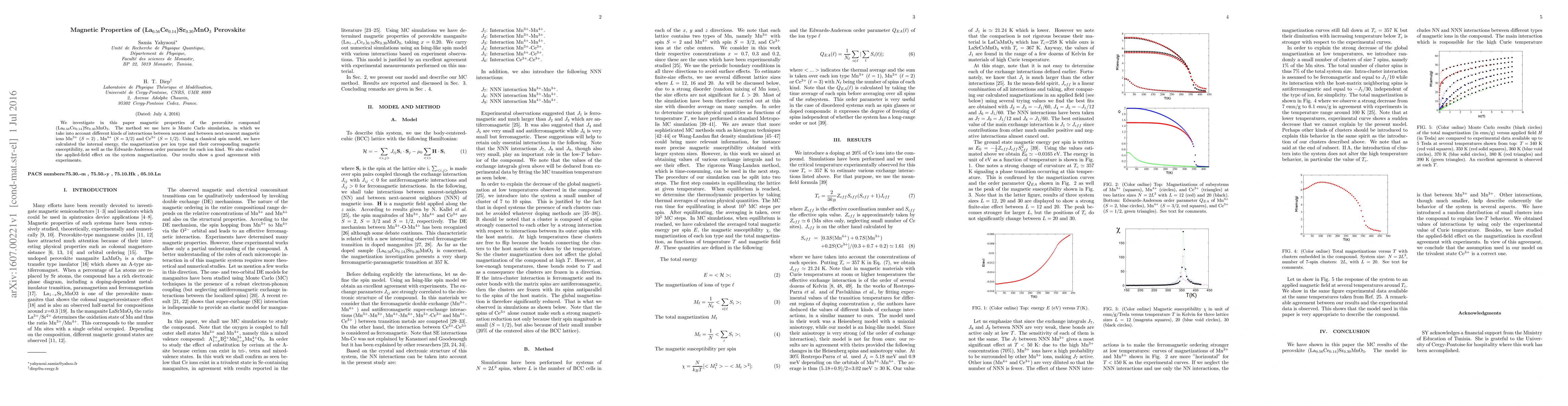 We investigate in this paper magnetic properties of the perovskite compound (La0.56Ce0.14)Sr0.30MnO3. The method we use here is Monte Carlo simulation, in which we take into account different kinds of interactions between nearest and between next-nearest magnetic ions Mn 3+ (S = 2) , Mn 4+ (S = 3/2) and Ce 3+ (S = 1/2). Using a classical spin model, we have calculated the internal energy, the magnetization per ion type and their corresponding magnetic susceptibility, as well as the Edwards-Anderson order parameter for each ion kind. We also studied the applied-field effect on the system magnetization. Our results show a good agreement with experiments.