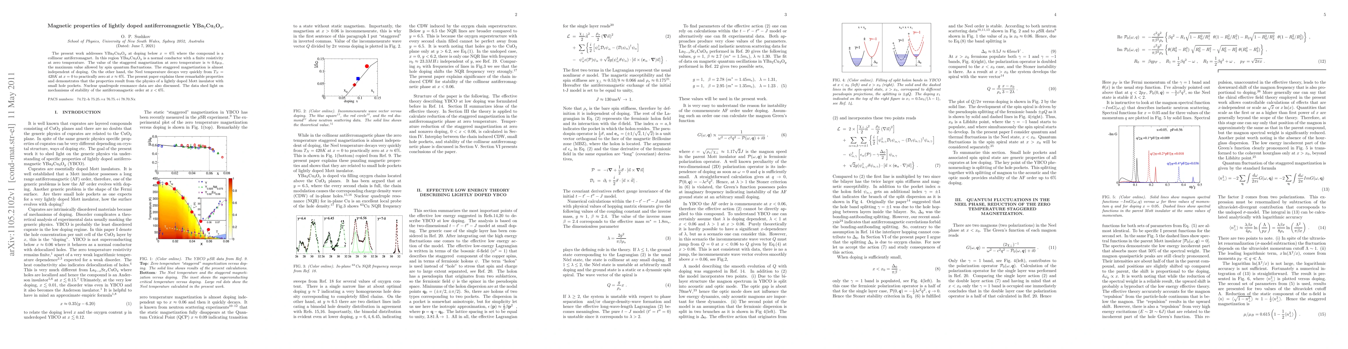 The present work addresses YBa$_{2}$Cu$_{3}$O$_{y}$ at doping below x=6% where the compound is a collinear antiferromagnet. In this region YBa$_{2}$Cu$_{3}$O$_{y}$ is a normal conductor with a finite resistivity at zero temperature. The value of the staggered magnetization at zero temperature is 0.6\mu_B, the maximum value allowed by spin quantum fluctuations. The staggered magnetization is almost independent of doping. On the other hand, the Neel temperature decays very quickly from T_N=420K at x=0 to practically zero at x = 0.06. The present paper explains these remarkable properties and demonstrates that the properties result from the physics of a lightly doped Mott insulator with small hole pockets. Nuclear quadrupole resonance data are also discussed. The data shed light on mechanisms of stability of the antiferromagnetic order at x < 6%.