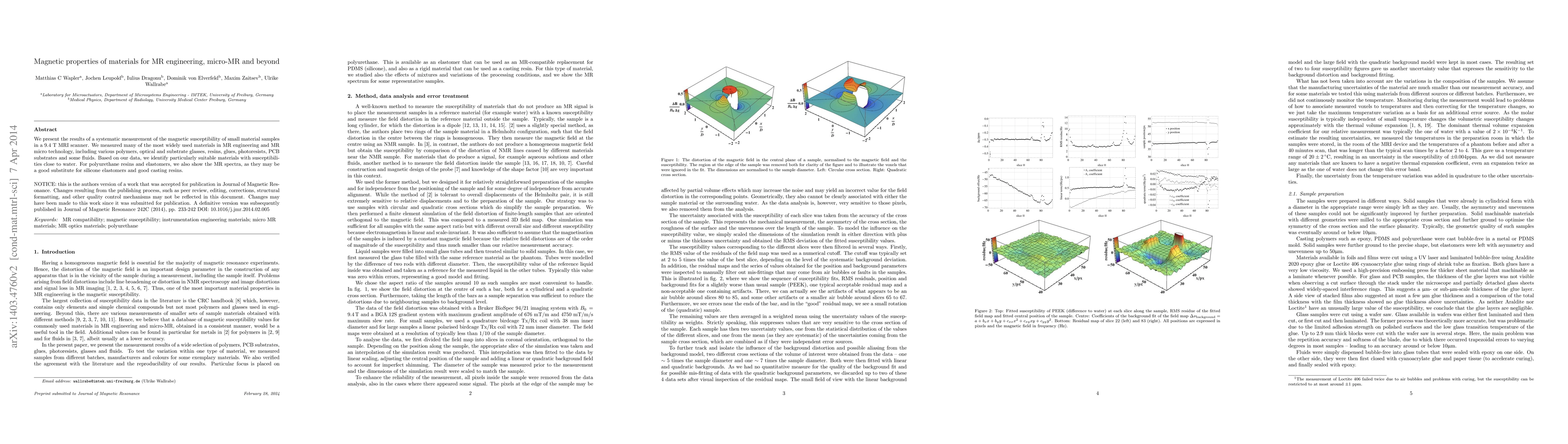 This study systematically measures the magnetic susceptibility of various materials used in MR engineering and micro-MR technology, identifying those with susceptibilities close to water. The research also presents MR spectra for polyurethane resins and elastomers, suggesting they may serve as alternatives to silicone elastomers and casting resins.