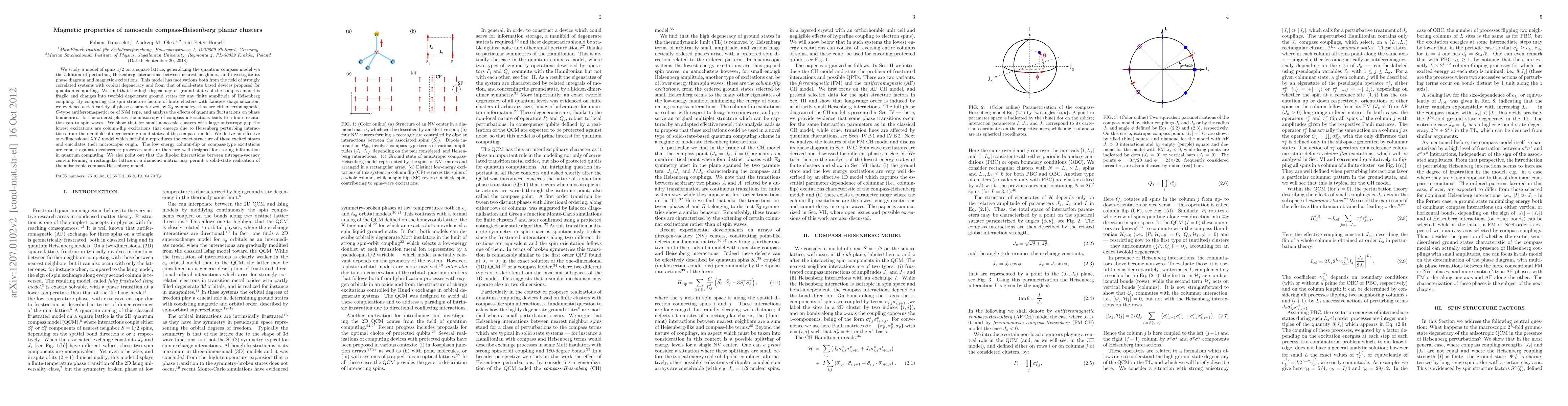 The research employs a combination of quantum mechanical modeling and exact diagonalization techniques on finite clusters to study the magnetic properties of nanoscale compass-Heisenberg planar clusters, investigating their phase diagram and magnetic excitations.