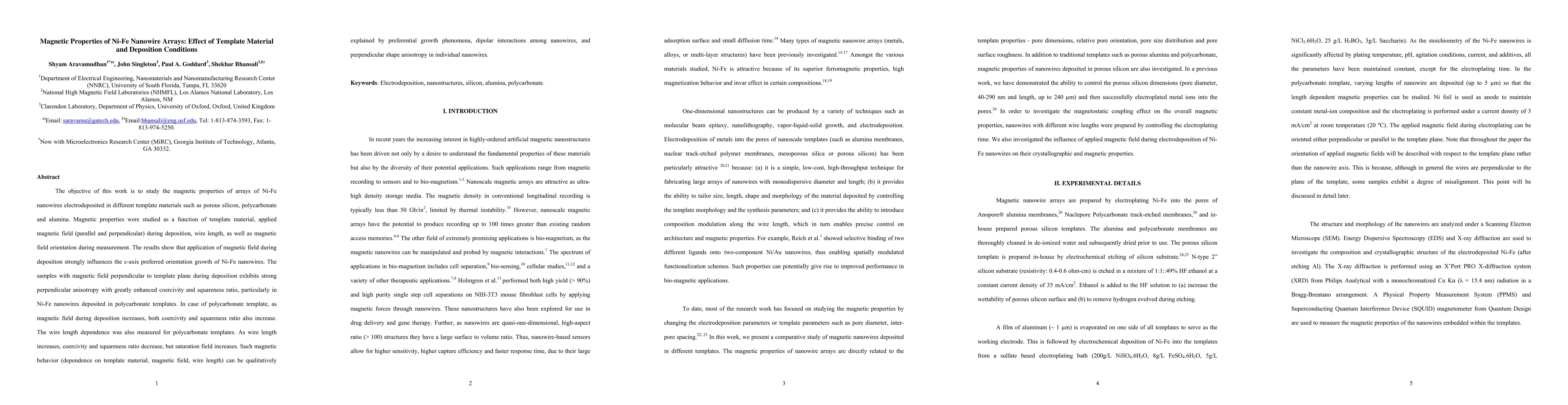 This study investigates the magnetic properties of Ni-Fe nanowire arrays electrodeposited in various templates, focusing on the influence of template material and deposition conditions. Results indicate strong perpendicular anisotropy and enhanced coercivity in polycarbonate templates, with magnetic field orientation during deposition significantly affecting nanowire growth and magnetic behavior.