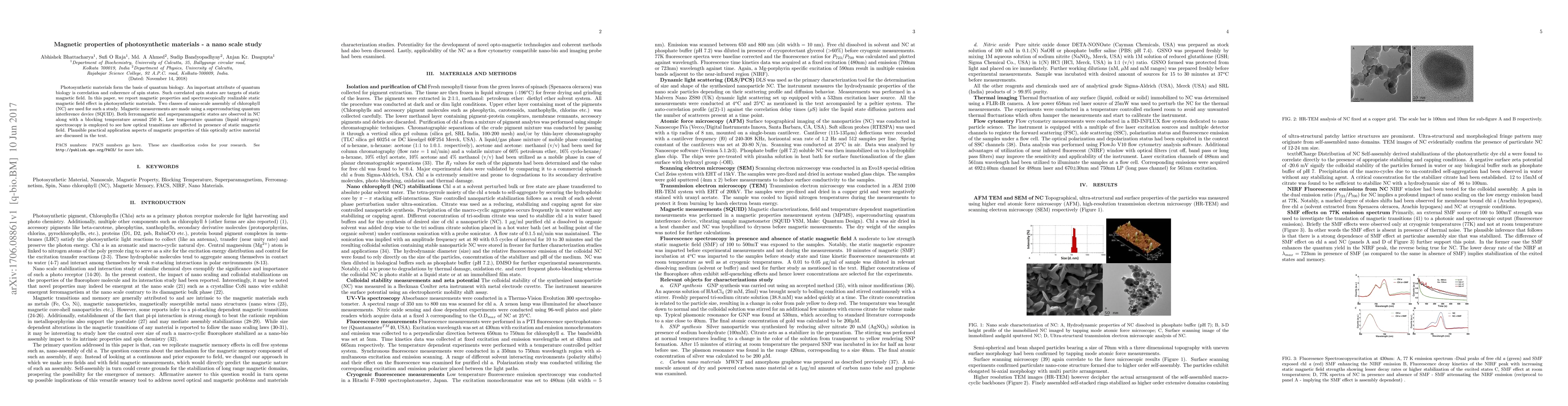 Photosynthetic materials form the basis of quantum biology. An important attribute of quantum biology is correlation and coherence of spin states. Such correlated spin states are targets of static magnetic field. In this paper, we report magnetic properties and spectroscopically realizable static magnetic field effect in photosynthetic materials. Two classes of nano-scale assembly of chlorophyll (NC) are used for such a study. Magnetic measurements are made using a superconducting quantum interference device (SQUID). Both ferromagnetic and superparamagnetic states are observed in NC along with a blocking temperature around 250 K. Low temperature quantum (liquid nitrogen) spectroscopy is employed to see how optical transitions are affected in presence of static magnetic field. Plausible practical application aspects of magnetic properties of this optically active material are discussed in the text.