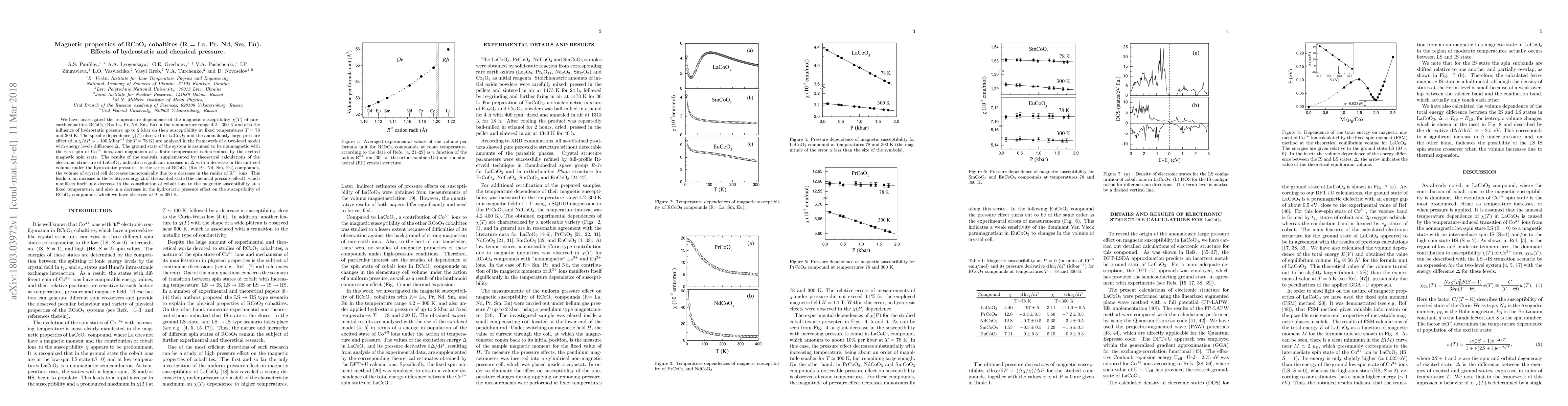 Researchers studied magnetic properties of rare-earth cobaltites under hydrostatic and chemical pressure, finding that decreasing crystal volume increases the energy difference between spin states and decreases magnetic susceptibility.