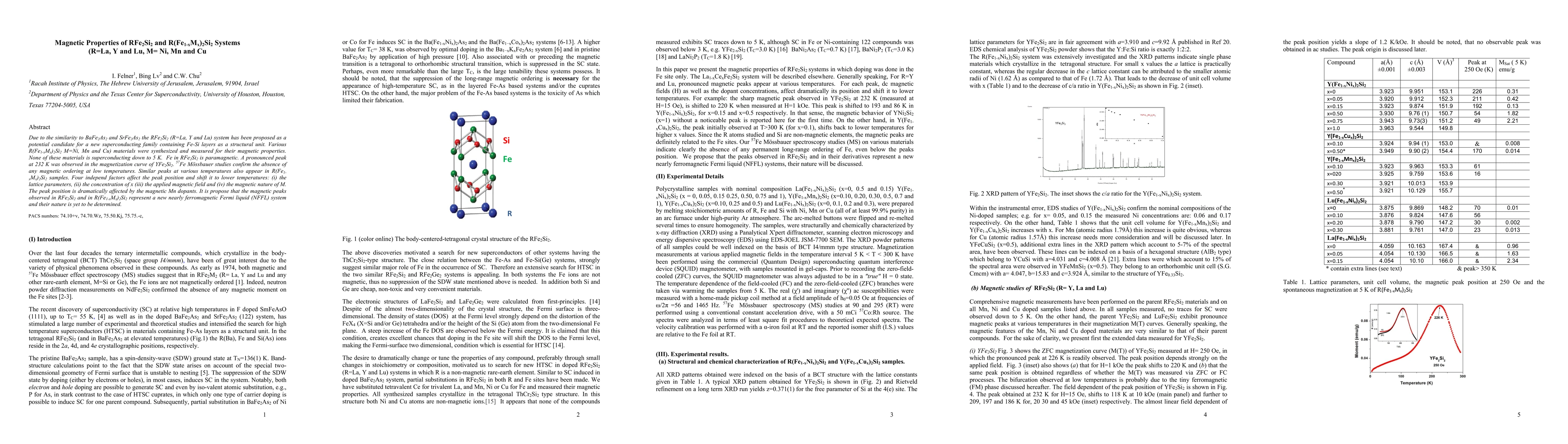 Due to the similarity to BaFe2As2 and SrFe2As2 the RFe2Si2 (R=La, Y and Lu) system has been proposed as a potential candidate for a new superconducting family containing Fe-Si layers as a structural unit. Various R(Fe1-xMx)2Si2 M=Ni, Mn and Cu) materials were synthesized and measured for their magnetic properties. None of these materials is superconducting down to 5 K. Fe in RFe2Si2 is paramagnetic. A pronounced peak at 232 K was observed in the magnetization curve of YFe2Si2. 57Fe M\"ossbauer studies confirm the absence of any magnetic ordering at low temperatures. Similar peaks at various temperatures also appear in R(Fe1-xMx)2Si2 samples. Four independent factors affect the peak position and shift it to lower temperatures: (i) the lattice parameters, (ii) the concentration of x, (iii) the applied magnetic field, and (iv) the magnetic nature of M. The peak position is dramatically affected by the magnetic Mn dopants. It is propose that the magnetic peaks observed in RFe2Si2 and in R(Fe1-xMx)2Si2 represent a new nearly ferromagnetic Fermi liquid (NFFL) system and their nature is yet to be determined.