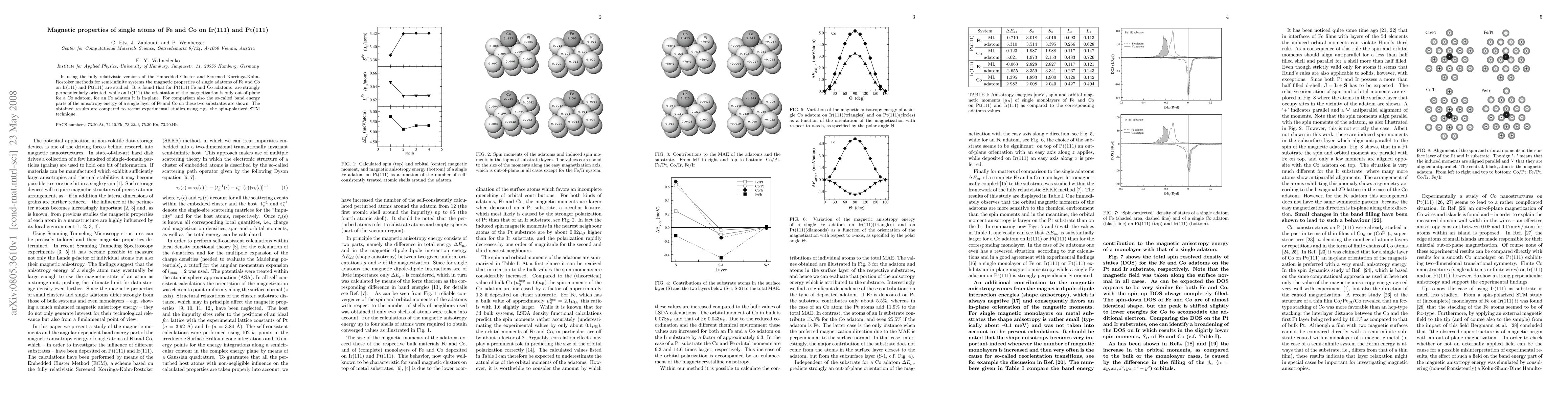 In using the fully relativistic versions of the Embedded Cluster and Screened Korringa-Kohn-Rostoker methods for semi-infinite systems the magnetic properties of single adatoms of Fe and Co on Ir(111) and Pt(111) are studied. It is found that for Pt(111) Fe and Co adatoms are strongly perpendicularly oriented, while on Ir(111) the orientation of the magnetization is only out-of-plane for a Co adatom, for an Fe adatom it is in-plane. For comparison also the so-called band energy parts of the anisotropy energy of a single layer of Fe and Co on these two substrates are shown. The obtained results are compared to recent experimental studies using e.g. the spin-polarized STM technique.