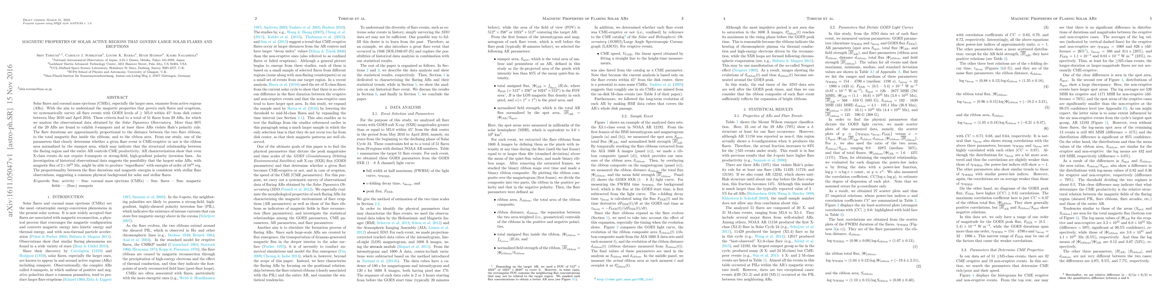 Solar flares and coronal mass ejections (CMEs), especially the larger ones, emanate from active regions (ARs). With the aim to understand the magnetic properties that govern such flares and eruptions, we systematically survey all flare events with GOES levels of >=M5.0 within 45 deg from disk center between May 2010 and April 2016. These criteria lead to a total of 51 flares from 29 ARs, for which we analyze the observational data obtained by the Solar Dynamics Observatory. More than 80% of the 29 ARs are found to exhibit delta-sunspots and at least three ARs violate Hale's polarity rule. The flare durations are approximately proportional to the distance between the two flare ribbons, to the total magnetic flux inside the ribbons, and to the ribbon area. From our study, one of the parameters that clearly determine whether a given flare event is CME-eruptive or not is the ribbon area normalized by the sunspot area, which may indicate that the structural relationship between the flaring region and the entire AR controls CME productivity. AR characterization show that even X-class events do not require delta-sunspots or strong-field, high-gradient polarity inversion lines. An investigation of historical observational data suggests the possibility that the largest solar ARs, with magnetic flux of 2x10^23 Mx, might be able to produce "superflares" with energies of order of 10^34 erg. The proportionality between the flare durations and magnetic energies is consistent with stellar flare observations, suggesting a common physical background for solar and stellar flares.