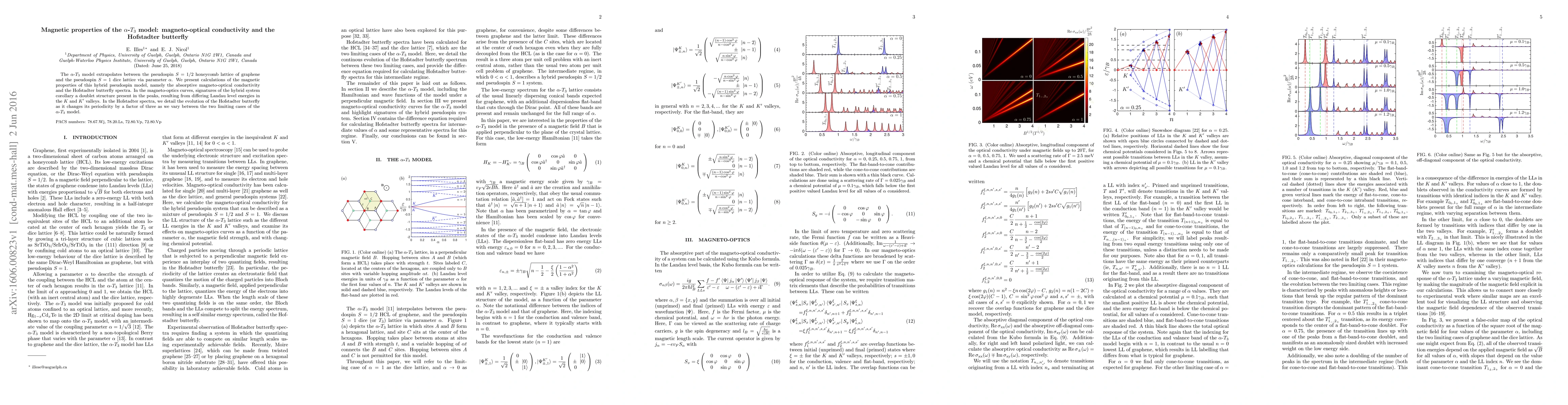 This paper investigates the magnetic properties of the $\alpha$-$T_3$ model, focusing on its magneto-optical conductivity and Hofstadter butterfly spectra. It reveals a doublet structure in the magneto-optics due to differing Landau levels in graphene's $K$ and $K^{\prime}$ valleys, and describes the Hofstadter butterfly's evolution as the model transitions between its pseudospin $S=1/2$ and $S=1$ lattices.