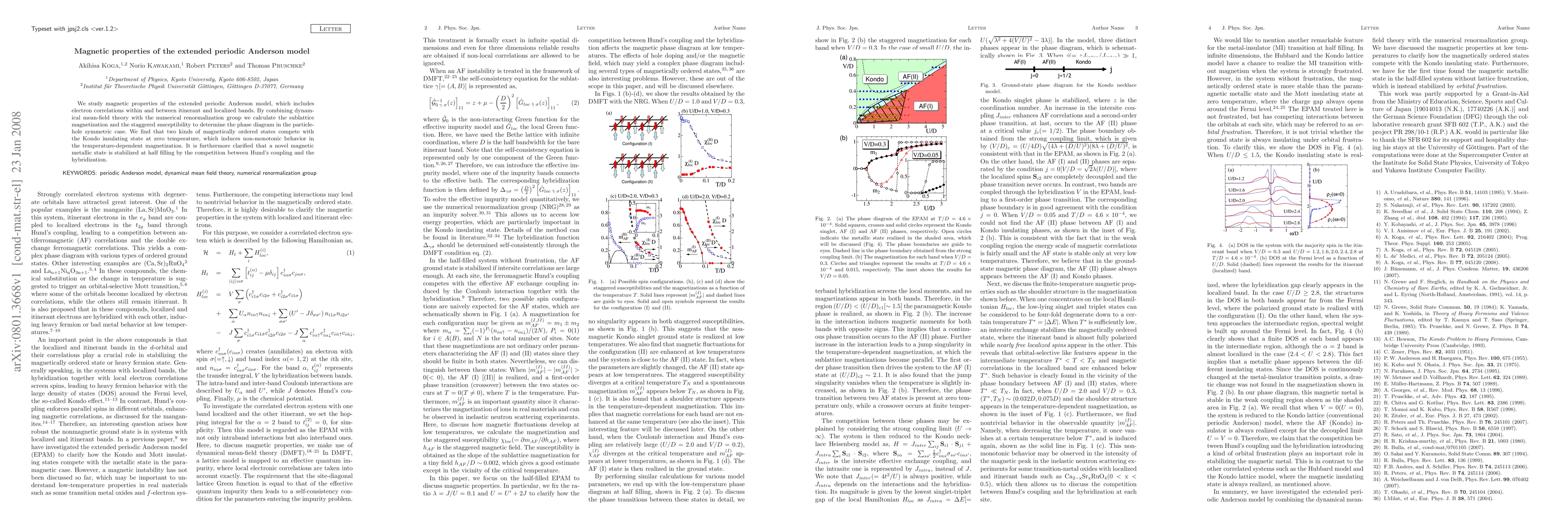 This paper investigates the magnetic properties of the extended periodic Anderson model using dynamical mean-field theory and numerical renormalization group. It reveals competing magnetically ordered states and a novel magnetic metallic state at half filling, leading to non-monotonic temperature-dependent magnetization.