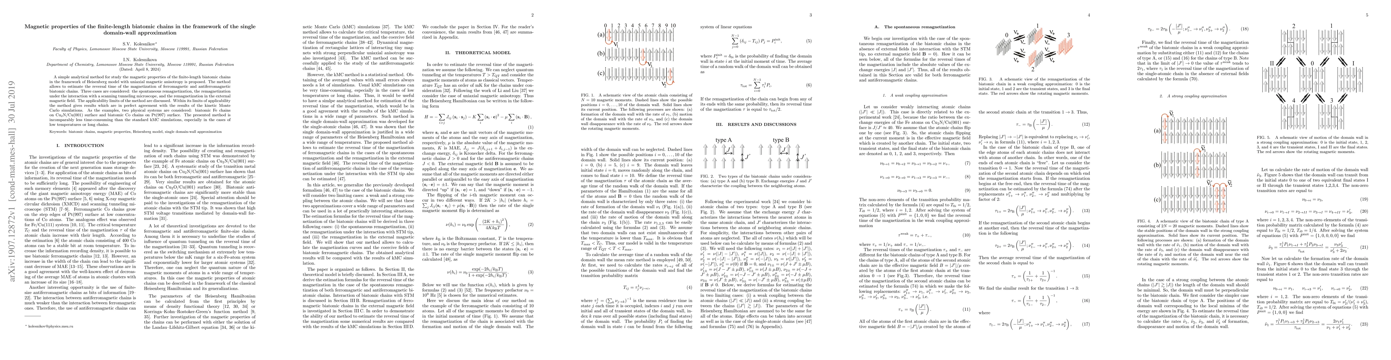 A simple analytical method for study the magnetic properties of the finite-length biatomic chains in the framework of Heisenberg model with uniaxial magnetic anisotropy is proposed. The method allows to estimate the reversal time of the magnetization of ferromagnetic and antiferromagnetic biatomic chains. Three cases are considered: the spontaneous remagnetization, the remagnetization under the interaction with a scanning tunneling microscope, and the remagnetization in the external magnetic field. The applicability limits of the method are discussed. Within its limits of applicability the method gives results which are in perfect agreement with the results of the kinetic Monte Carlo simulations. As the examples, two physical systems are considered: biatomic Fe chains on Cu2N/Cu(001) surface and biatomic Co chains on Pt(997) surface. The presented method is incomparably less time-consuming than the standard kMC simulations, especially in the cases of low temperatures or long chains.