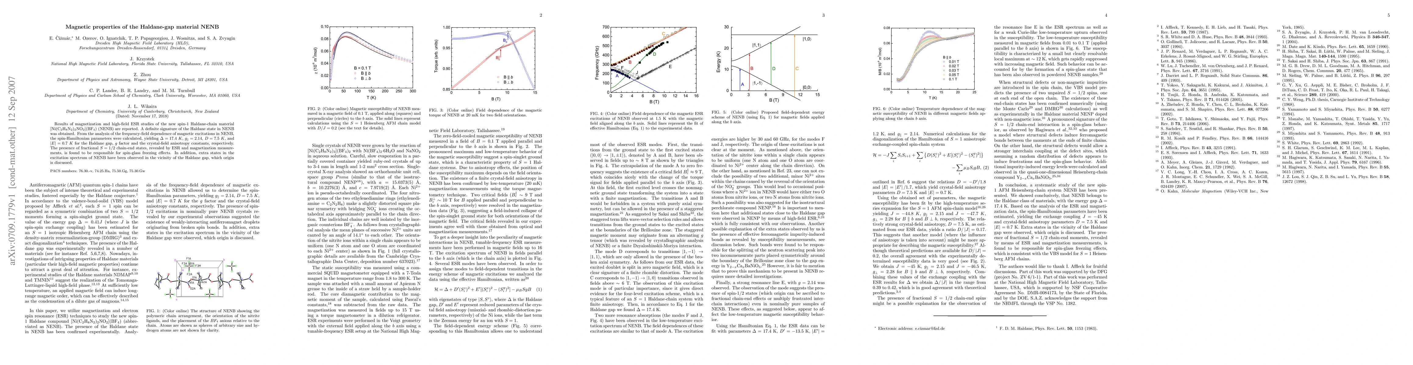The paper presents magnetic property studies on the Haldane-gap material NENB, confirming its Haldane state with calculated parameters: Delta = 17.4 K, g_parallel = 2.14, D = 7.5 K, and |E| = 0.7 K. Fractional S = 1/2 chain-end states cause spin-glass freezing, and additional states near the Haldane gap are also observed.