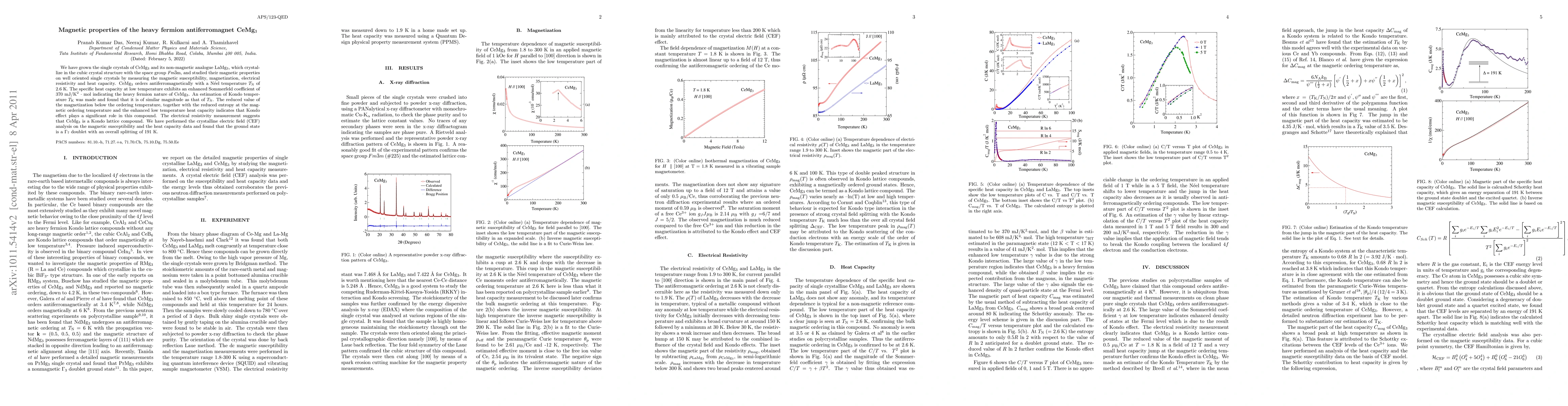 Researchers studied the magnetic properties of CeMg$_3$, a heavy fermion antiferromagnet, finding an antiferromagnetic ordering temperature of 2.6 K and evidence of the Kondo effect at low temperatures.