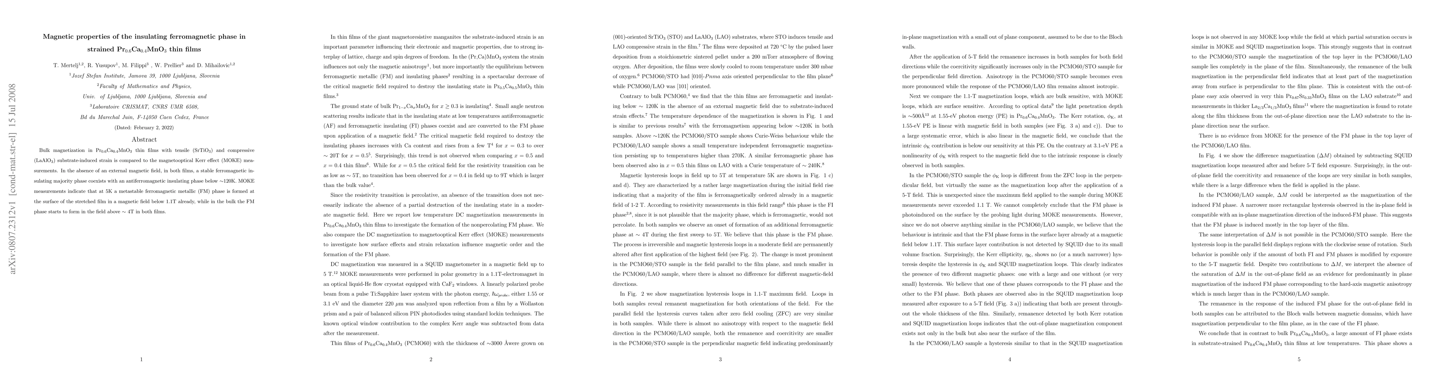 Researchers studied the magnetic properties of strained Pr0.6Ca0.4MnO3 thin films, finding a stable ferromagnetic insulating phase coexists with an antiferromagnetic phase below 120K, with surface and bulk phases forming at different temperatures in magnetic fields.