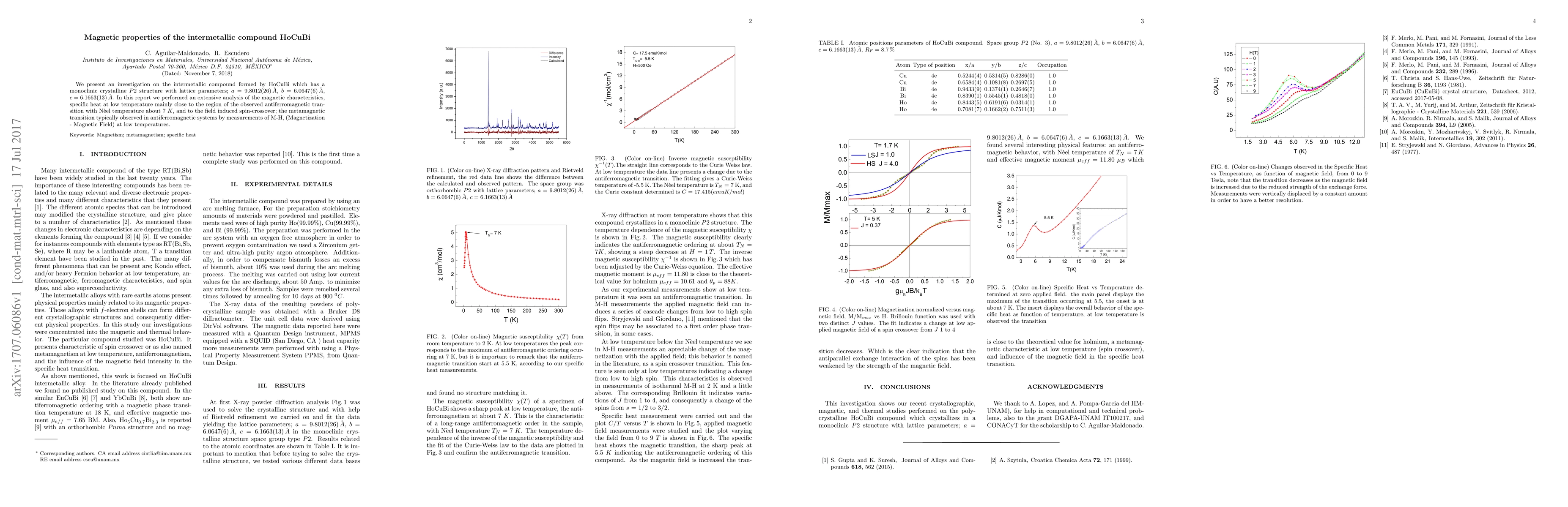We present an investigation on the intermetallic compound formed by HoCuBi which has a monoclinic crystalline P2 structure with lattice parameters; a = 9:8012(26)A, b = 6:0647(6)A, c = 6:1663(13)A. In this report we performed an extensive analysis of the magnetic characteristics, specific heat at low temperature mainly close to the region of the observed antiferromagnetic transition with Neel temperature about 7 K, and to the field induced spin-crossover; the metamagnetic transition typically observed in antiferromagnetic systems by measurements of M-H, (Magnetization - Magnetic Field) at low temperatures.