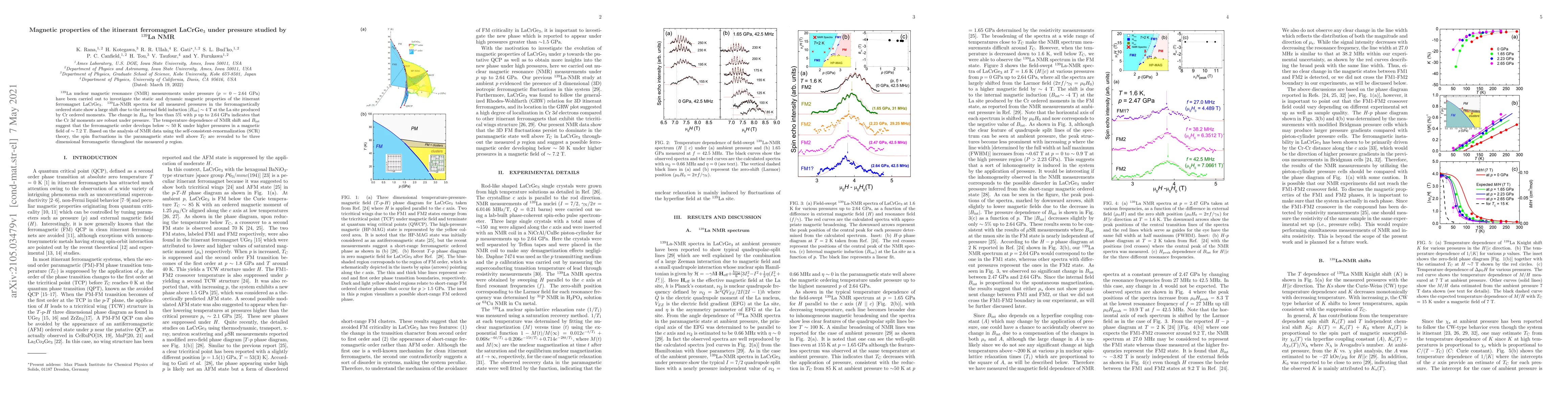 This study uses $^{139}$La NMR to investigate the magnetic properties of LaCrGe$_3$ under pressure, revealing robust Cr 3$d$ moments and three-dimensional ferromagnetic spin fluctuations. The ferromagnetic order emerges below $\sim$ 50 K under higher pressures and a magnetic field of $\sim$ 7.2 T.