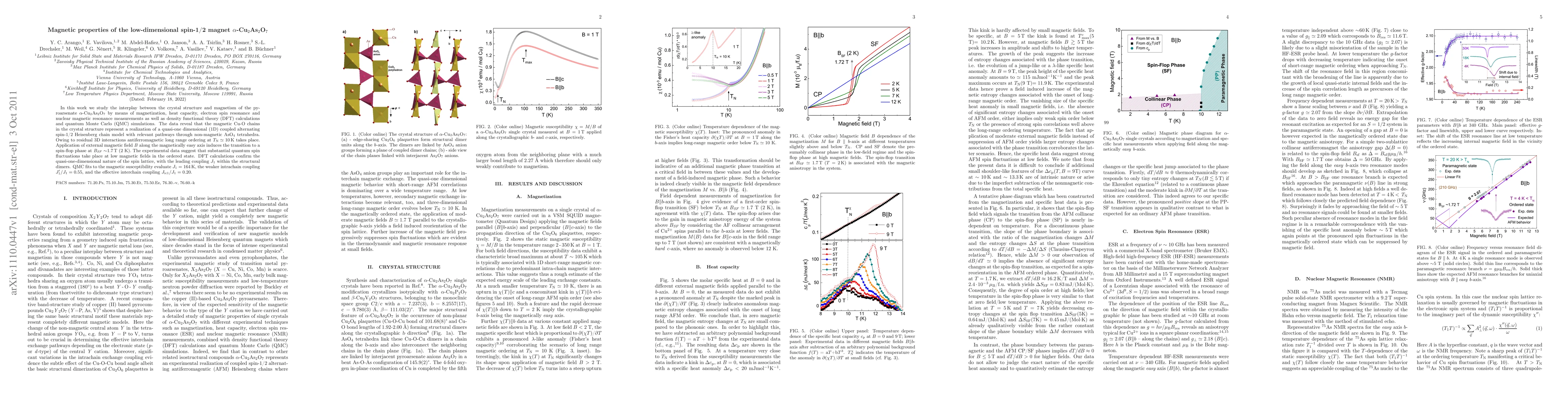 In this work we study the interplay between the crystal structure and magnetism of the pyroarsenate \alpha-Cu_2As_2O_7 by means of magnetization, heat capacity, electron spin resonance and nuclear magnetic resonance measurements as well as density functional theory (DFT) calculations and quantum Monte Carlo (QMC) simulations. The data reveal that the magnetic Cu-O chains in the crystal structure represent a realization of a quasi-one dimensional (1D) coupled alternating spin-1/2 Heisenberg chain model with relevant pathways through non-magnetic AsO_4 tetrahedra. Owing to residual 3D interactions antiferromagnetic long range ordering at T_N\simeq10K takes place. Application of external magnetic field B along the magnetically easy axis induces the transition to a spin-flop phase at B_{SF}~1.7T (2K). The experimental data suggest that substantial quantum spin fluctuations take place at low magnetic fields in the ordered state. DFT calculations confirm the quasi-one-dimensional nature of the spin lattice, with the leading coupling J_1 within the structural dimers. QMC fits to the magnetic susceptibility evaluate J_1=164K, the weaker intrachain coupling J'_1/J_1 = 0.55, and the effective interchain coupling J_{ic1}/J_1 = 0.20.