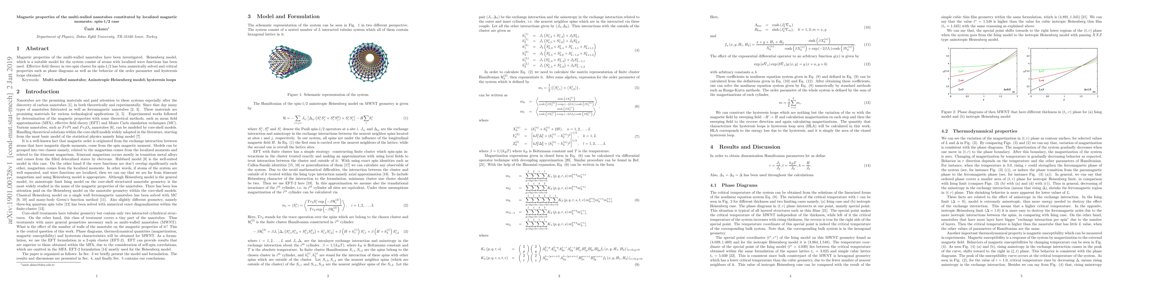Magnetic properties of the multi-walled nanotubes have been investigated. Heisenberg model, which is a suitable model for the system consist of atoms with localized wave functions has been used. Effective field theory in two spin cluster for spin-1/2 has been numerically solved and critical properties such as phase diagrams as well as the behavior of the order parameter and hysteresis loops obtained.