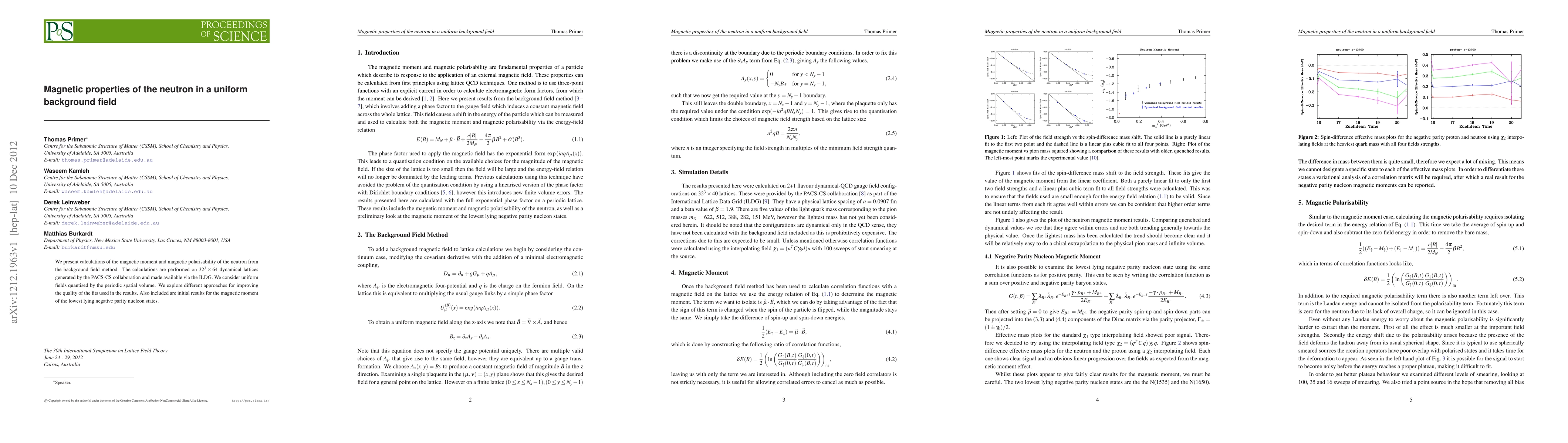 We present calculations of the magnetic moment and magnetic polarisability of the neutron from the background field method. The calculations are performed on $32^3\times64$ dynamical lattices generated by the PACS-CS collaboration and made available via the ILDG. We consider uniform fields quantised by the periodic spatial volume. We explore different approaches for improving the quality of the fits used in the results. Also included are initial results for the magnetic moment of the lowest lying negative parity nucleon states.