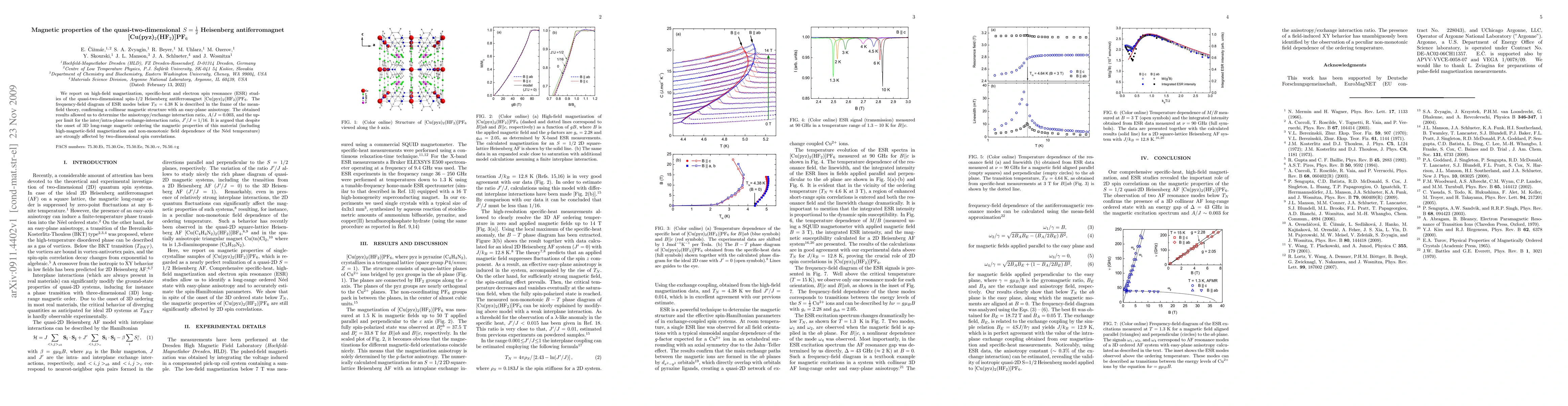 We report on high-field magnetization, specific-heat and electron spin resonance (ESR) studies of the quasi-two-dimensional spin-1/2 Heisenberg antiferromagnet [Cu(pyz)2(HF2)]PF6. The frequency-field diagram of ESR modes below TN = 4.38 K is described in the frame of the meanfield theory, confirming a collinear magnetic structure with an easy-plane anisotropy. The obtained results allowed us to determine the anisotropy/exchange interaction ratio, A/J = 0.003, and the upper limit for the inter/intra-plane exchange-interaction ratio, J'/J = 1/16. It is argued that despite the onset of 3D long-range magnetic ordering the magnetic properties of this material (including high-magnetic-field magnetization and non-monotonic field dependence of the Neel temperature) are strongly affected by two-dimensional spin correlations.