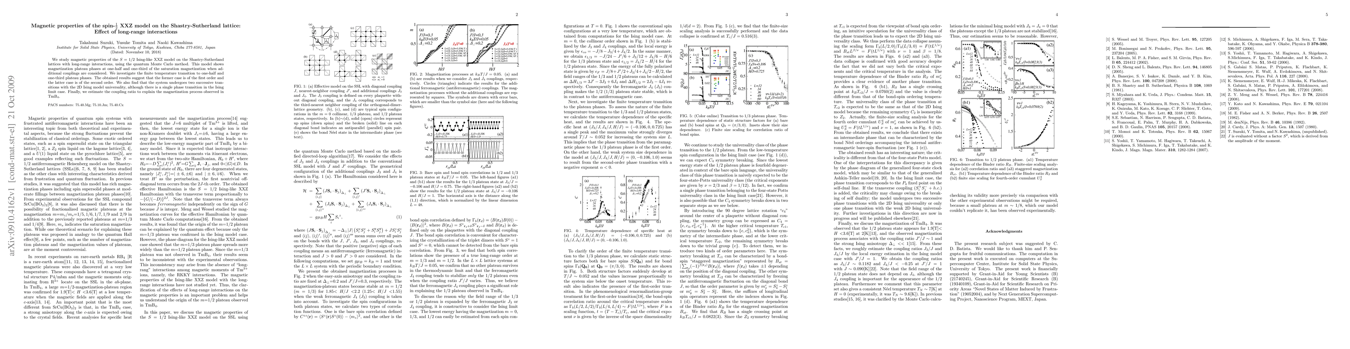 We study magnetic properties of the $S=1/2$ Ising-like XXZ model on the Shastry-Sutherland lattices with long-range interactions, using the quantum Monte Carlo method. This model shows magnetization plateau phases at one-half and one-third of the saturation magnetization when additional couplings are considered. We investigate the finite temperature transition to one-half and one-third plateau phases. The obtained results suggest that the former case is of the first order and the latter case is of the second order. We also find that the system undergoes two successive transitions with the 2D Ising model universality, although there is a single phase transition in the Ising limit case. Finally, we estimate the coupling ratio to explain the magnetization process observed in ${\rm TmB_4}$