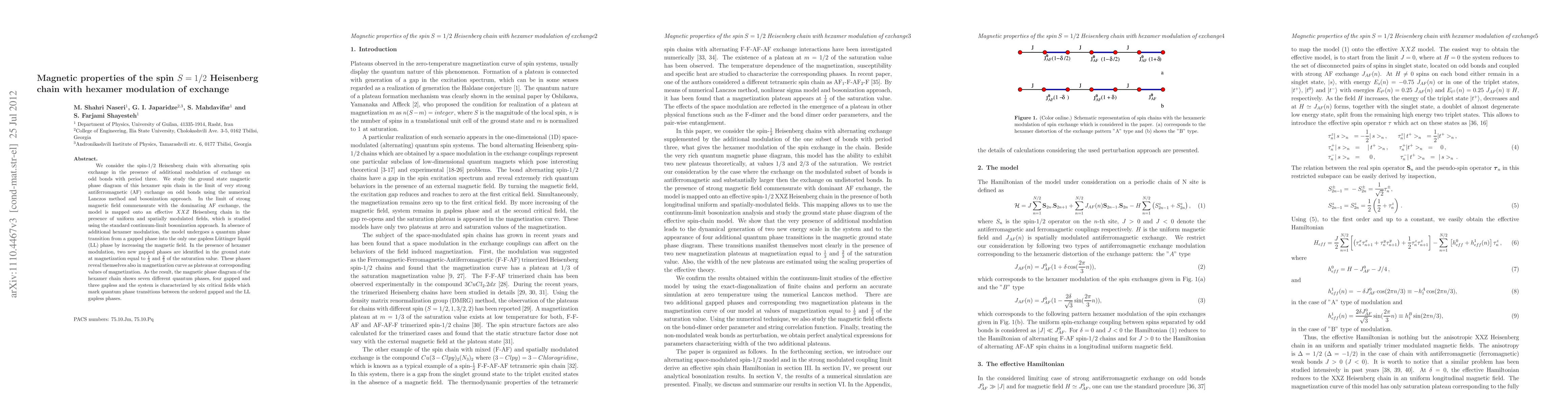 This study investigates the magnetic properties of a spin-1/2 Heisenberg chain with alternating exchange interactions and hexamer modulation, revealing a complex ground state phase diagram with seven distinct quantum phases, including four gapped and three gapless phases, characterized by six critical fields marking transitions between them.