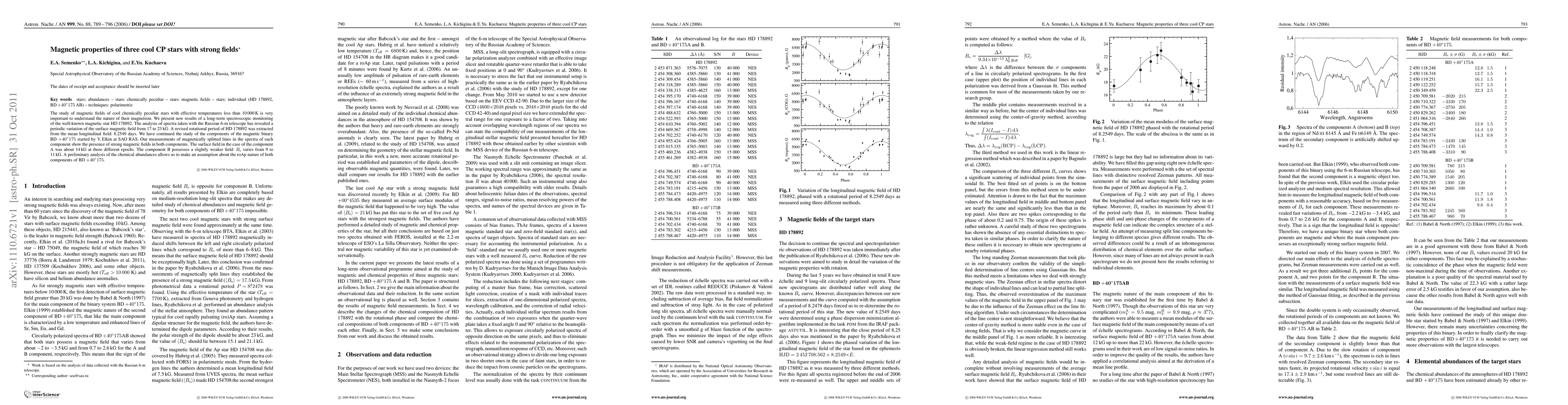 The study of magnetic fields of cool chemically peculiar stars with effective temperatures less than 10 000 K is very important to understand the nature of their magnetism. We present new results of a long-term spectroscopic monitoring of the well-known magnetic star HD 178892. The analysis of spectra taken with the Russian 6-m telescope has revealed a periodic variation of the surface magnetic field from 17 to 23 kG. A revised rotational period of HD 178892 was extracted from the mean longitudinal field: 8.2549 days. We have continued the study of the components of the magnetic binary BD +40^{\circ}175 started by V. Elkin at SAO RAS. Our measurements of magnetically splitted lines in the spectra of each component show the presence of strong magnetic fields in both components. The surface field in the case of the component A was about 14 kG at three different epochs. The component B possesses a slightly weaker field: B_{s} varies from 9 to 11 kG. A preliminary analysis of the chemical abundances allows us to make an assumption about the roAp nature of both components of BD +40^{\circ}175.