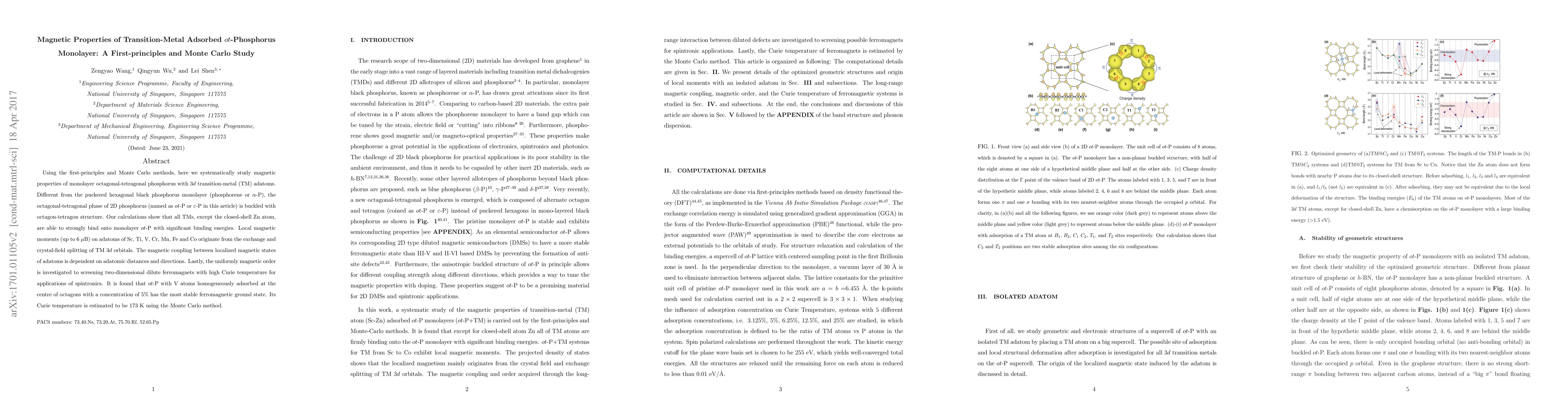 This study employs first-principles and Monte Carlo methods to explore the magnetic properties of octagonal-tetragonal phosphorus monolayers with adsorbed 3d transition-metal adatoms. It finds that all TM adatoms except Zn bind strongly to the ot-P monolayer, with significant local magnetic moments, and a stable dilute ferromagnet configuration with V adatoms at a concentration of 5% exhibits a high Curie temperature of 173 K.