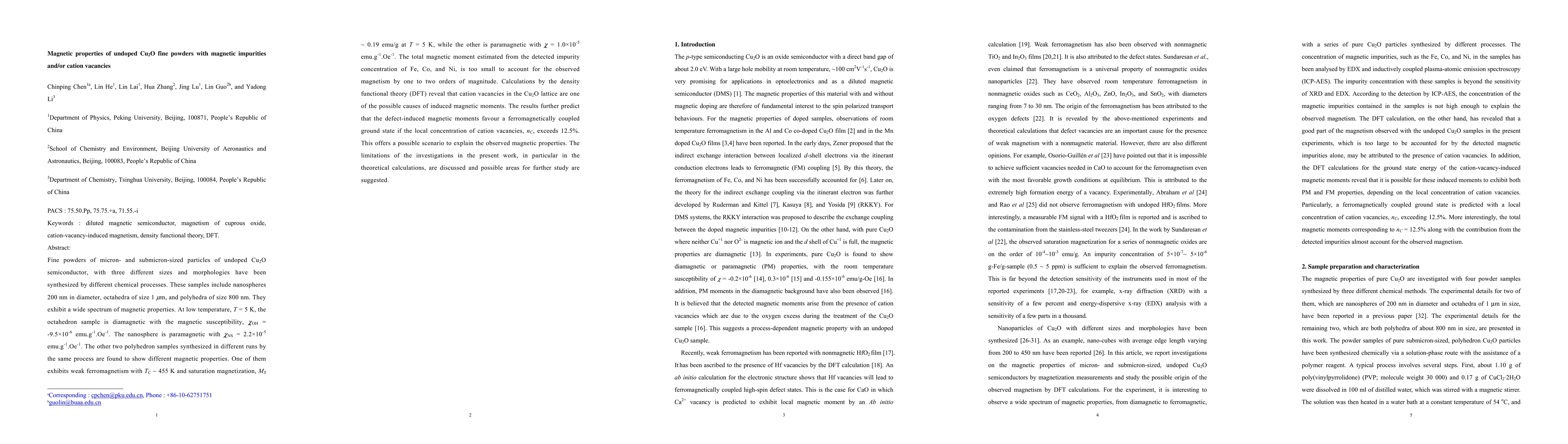 Fine powders of micron- and submicron-sized particles of undoped Cu2O semiconductor, with three different sizes and morphologies have been synthesized by different chemical processes. These samples include nanospheres 200 nm in diameter, octahedra of size 1 micron, and polyhedra of size 800 nm. They exhibit a wide spectrum of magnetic properties. At low temperature, T = 5 K, the octahedron sample is diamagnetic. The nanosphere is paramagnetic. The other two polyhedron samples synthesized in different runs by the same process are found to show different magnetic properties. One of them exhibits weak ferromagnetism with T_C = 455 K and saturation magnetization, M_S = 0.19 emu/g at T = 5 K, while the other is paramagnetic. The total magnetic moment estimated from the detected impurity concentration of Fe, Co, and Ni, is too small to account for the observed magnetism by one to two orders of magnitude. Calculations by the density functional theory (DFT) reveal that cation vacancies in the Cu2O lattice are one of the possible causes of induced magnetic moments. The results further predict that the defect-induced magnetic moments favour a ferromagnetically coupled ground state if the local concentration of cation vacancies, n_C, exceeds 12.5%. This offers a possible scenario to explain the observed magnetic properties. The limitations of the investigations in the present work, in particular in the theoretical calculations, are discussed and possible areas for further study are suggested.