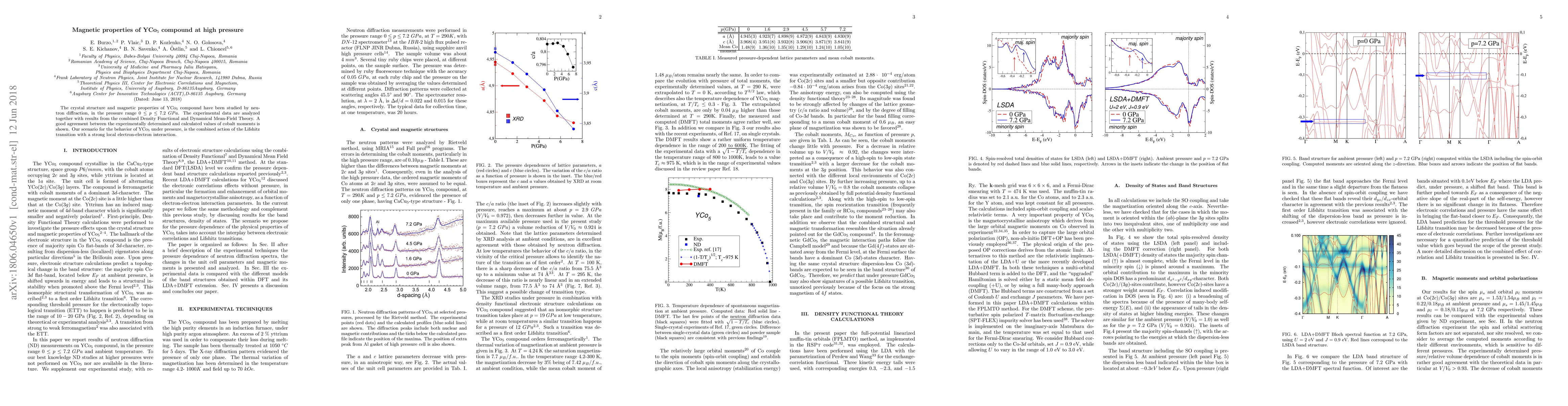 The crystal structure and magnetic properties of YCo$_5$ compound have been studied by neutron diffraction, in the pressure range $0 \le p \le 7.2 \ GPa$. The experimental data are analyzed together with results from the combined Density Functional and Dynamical Mean-Field Theory. A good agreement between the experimentally determined and calculated values of cobalt moments is shown. Our scenario for the behavior of YCo$_5$ under pressure, is the combined action of the Lifshitz transition with a strong local electron-electron interaction.