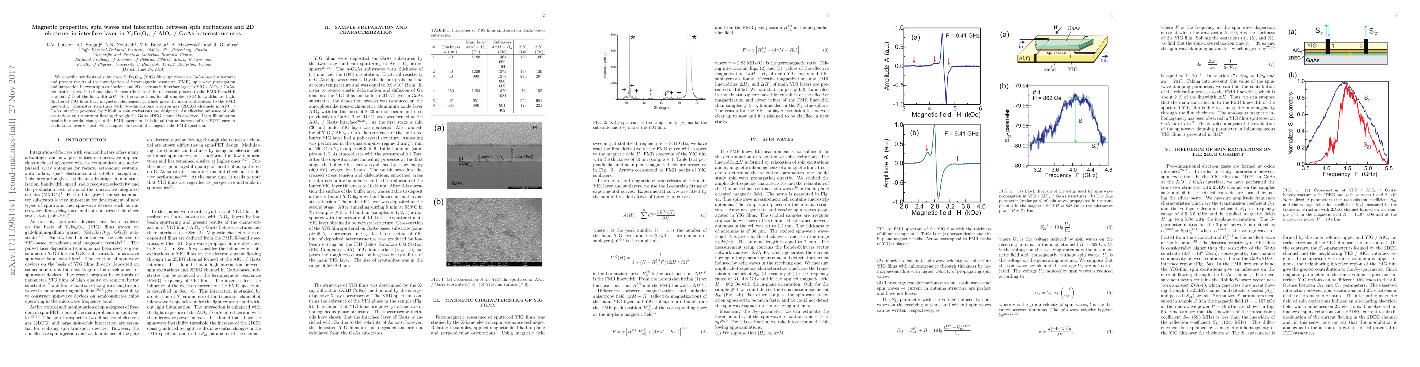 We describe synthesis of submicron Y3Fe5O12 (YIG) films sputtered on GaAs-based substrates and present results of the investigation of ferromagnetic resonance (FMR), spin wave propagation and interaction between spin excitations and 2D electrons in interface layer in YIG / AlOx / GaAs-heterostructures. It is found that the contribution of the relaxation process to the FMR linewidth is about 2 % of the linewidth \Delta H. At the same time, for all samples FMR linewidths are high. Sputtered YIG films have magnetic inhomogeneity, which gives the main contribution to the FMR linewidth. Transistor structures with two-dimensional electron gas (2DEG) channels in AlOx / GaAs interface governed by YIG-film spin excitations are designed. An effective influence of spin excitations on the current flowing through the GaAs 2DEG channel is observed. Light illumination results in essential changes in the FMR spectrum. It is found that an increase of the 2DEG current leads to an inverse effect, which represents essential changes in the FMR spectrum.