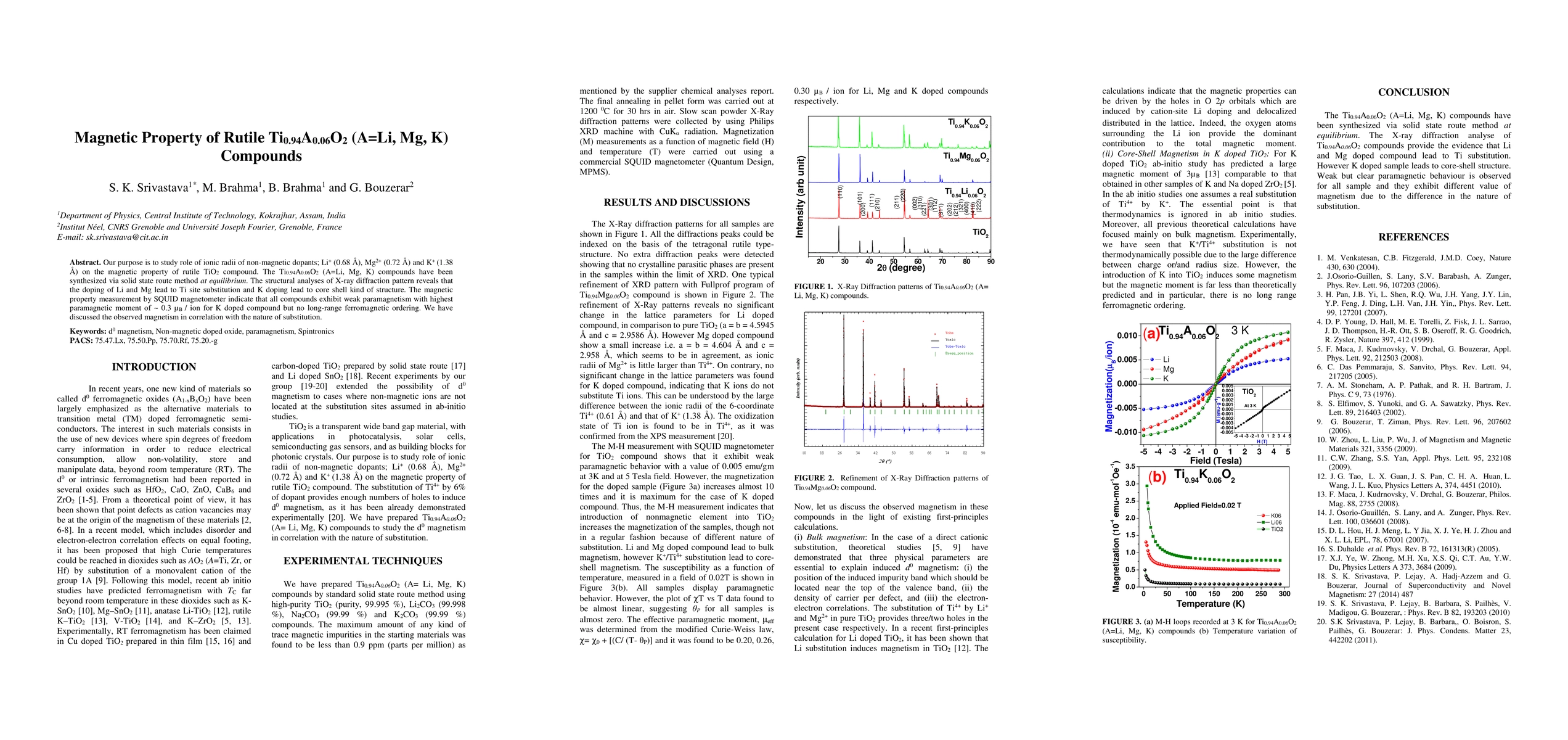 Our purpose is to study role of ionic radii of non-magnetic dopants; Li+ (0.68 {\AA}), Mg2+ (0.72 {\AA}) and K+ (1.38 {\AA}) on the magnetic property of rutile TiO2 compound. The Ti0.94A0.06O2 (A=Li, Mg, K) compounds have been synthesized via solid state route method at equilibrium. The structural analyses of X-ray diffraction pattern reveals that the doping of Li and Mg lead to Ti site substitution and K doping lead to core shell kind of structure. The magnetic property measurement by SQUID magnetometer indicate that all compounds exhibit weak paramagnetism with highest paramagnetic moment of ~ 0.3 MuB / ion for K doped compound but no long-range ferromagnetic ordering. We have discussed the observed magnetism in correlation with the nature of substitution.