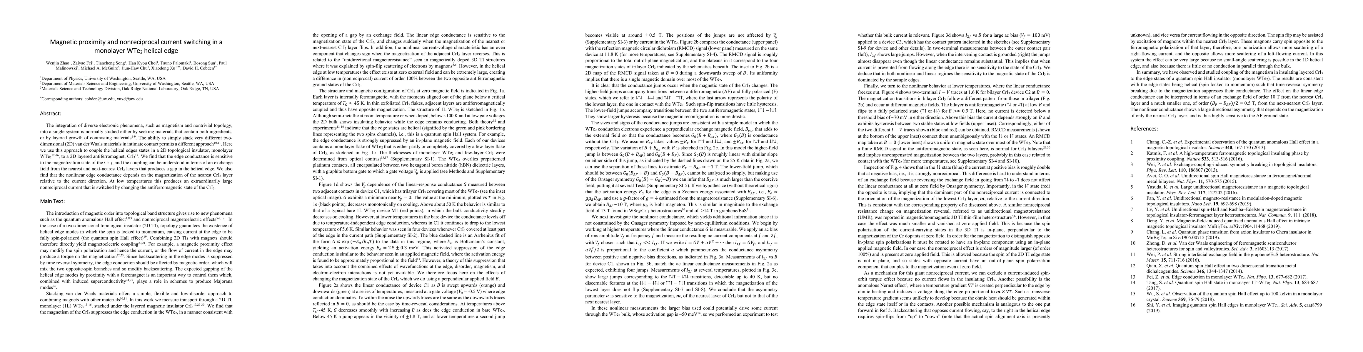 The integration of diverse electronic phenomena, such as magnetism and nontrivial topology, into a single system is normally studied either by seeking materials that contain both ingredients, or by layered growth of contrasting materials. The ability to simply stack very different two dimensional (2D) van der Waals materials in intimate contact permits a different approach. Here we use this approach to couple the helical edges states in a 2D topological insulator, monolayer WTe2, to a 2D layered antiferromagnet, CrI3. We find that the edge conductance is sensitive to the magnetization state of the CrI3, and the coupling can be understood in terms of an exchange field from the nearest and next-nearest CrI3 layers that produces a gap in the helical edge. We also find that the nonlinear edge conductance depends on the magnetization of the nearest CrI3 layer relative to the current direction. At low temperatures this produces an extraordinarily large nonreciprocal current that is switched by changing the antiferromagnetic state of the CrI3.