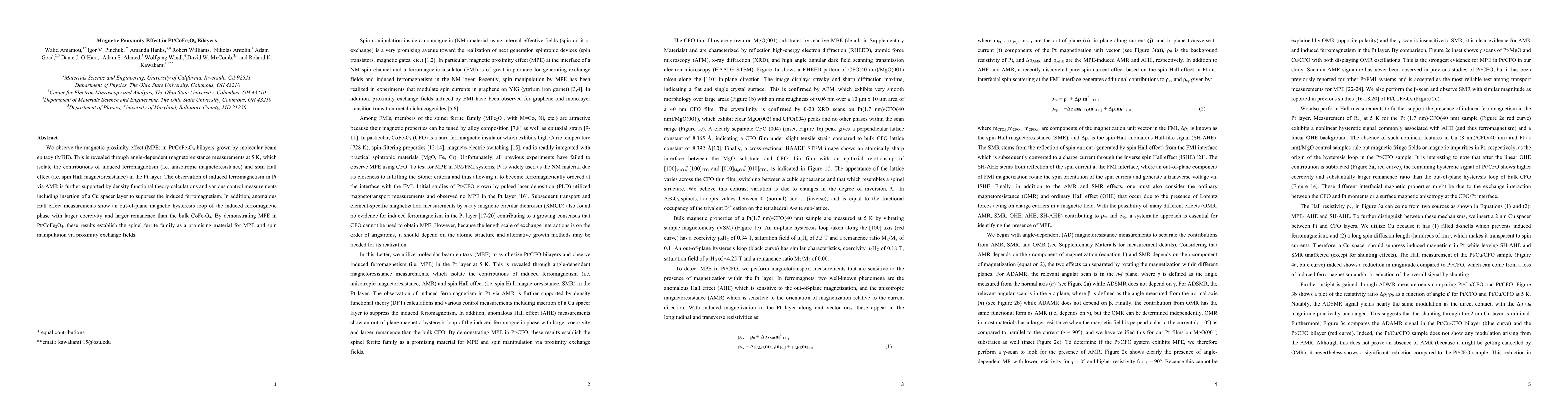 This study observes the magnetic proximity effect in Pt/CoFe2O4 bilayers, revealing induced ferromagnetism in Pt through angle-dependent magnetoresistance and supported by DFT calculations and control measurements. The findings suggest spinel ferrite materials are promising for spin manipulation.