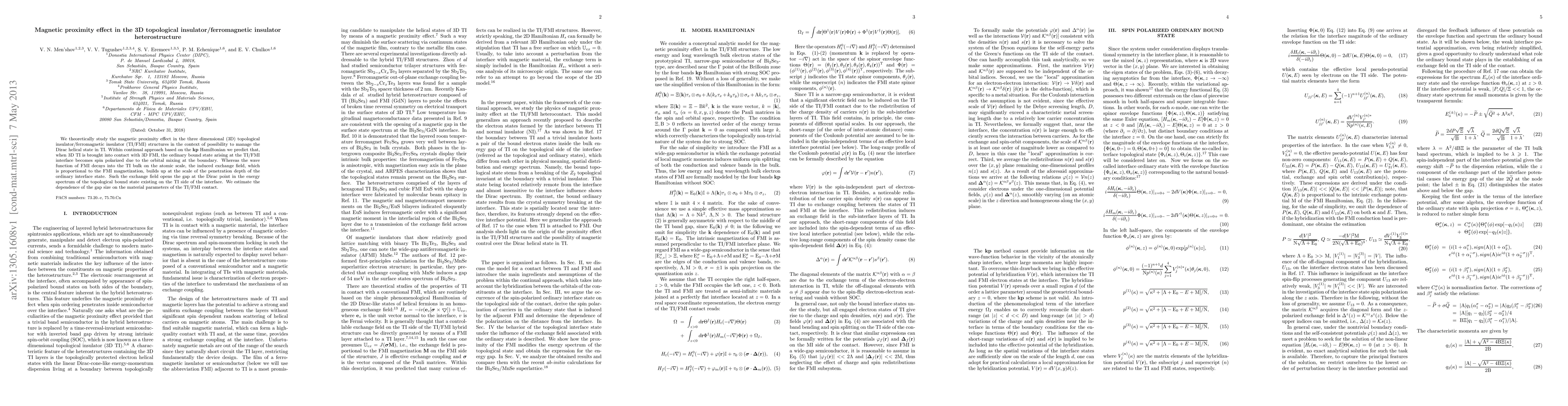 This research theoretically investigates the magnetic proximity effect in 3D topological insulator/ferromagnetic insulator heterostructures, predicting spin polarization of ordinary bound states at the interface due to orbital mixing, and the opening of a gap at the Dirac point via an induced exchange field proportional to the FMI magnetization. The study estimates the dependence of this gap size on the material parameters of the interface.