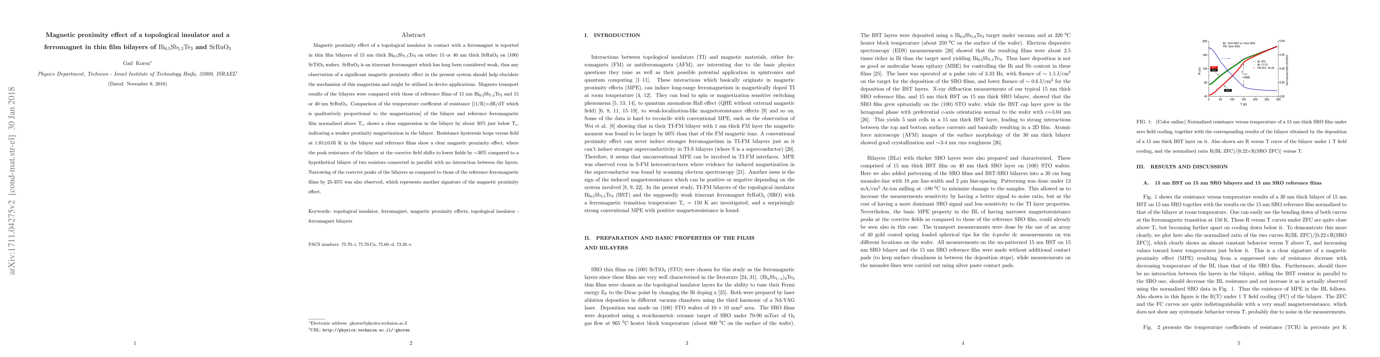 This paper reports the magnetic proximity effect in thin film bilayers of $BiSbTe_3$ and $SrRuO_3$, showing a 50% suppression in magnetization just below the critical temperature. The study also reveals a 30% shift in peak resistance and a 25-35% narrowing of coercive peaks in the bilayers, indicating a weaker proximity magnetization and a clear magnetic proximity effect.