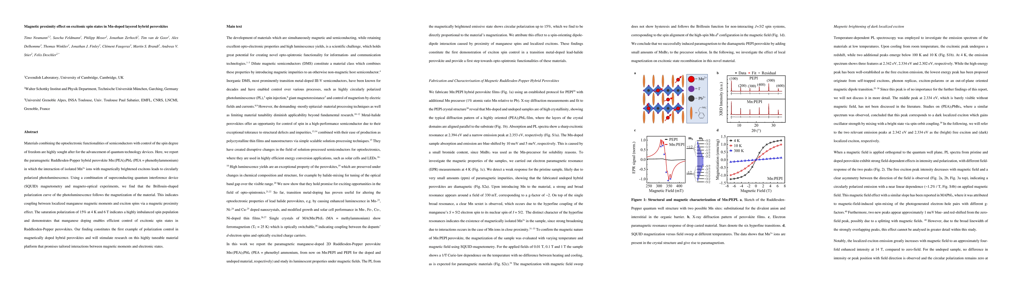 Materials combining the optoelectronic functionalities of semiconductors with control of the spin degree of freedom are highly sought after for the advancement of quantum technology devices. Here, we report the paramagnetic Ruddlesden-Popper hybrid perovskite Mn:(PEA)2PbI4 (PEA = phenethylammonium) in which the interaction of isolated Mn2+ ions with magnetically brightened excitons leads to circularly polarized photoluminescence. Using a combination of superconducting quantum interference device (SQUID) magnetometry and magneto-optical experiments, we find that the Brillouin-shaped polarization curve of the photoluminescence follows the magnetization of the material. This indicates coupling between localized manganese magnetic moments and exciton spins via a magnetic proximity effect. The saturation polarization of 15% at 4 K and 6 T indicates a highly imbalanced spin population and demonstrates that manganese doping enables efficient control of excitonic spin states in Ruddlesden-Popper perovskites. Our finding constitutes the first example of polarization control in magnetically doped hybrid perovskites and will stimulate research on this highly tuneable material platform that promises tailored interactions between magnetic moments and electronic states.
