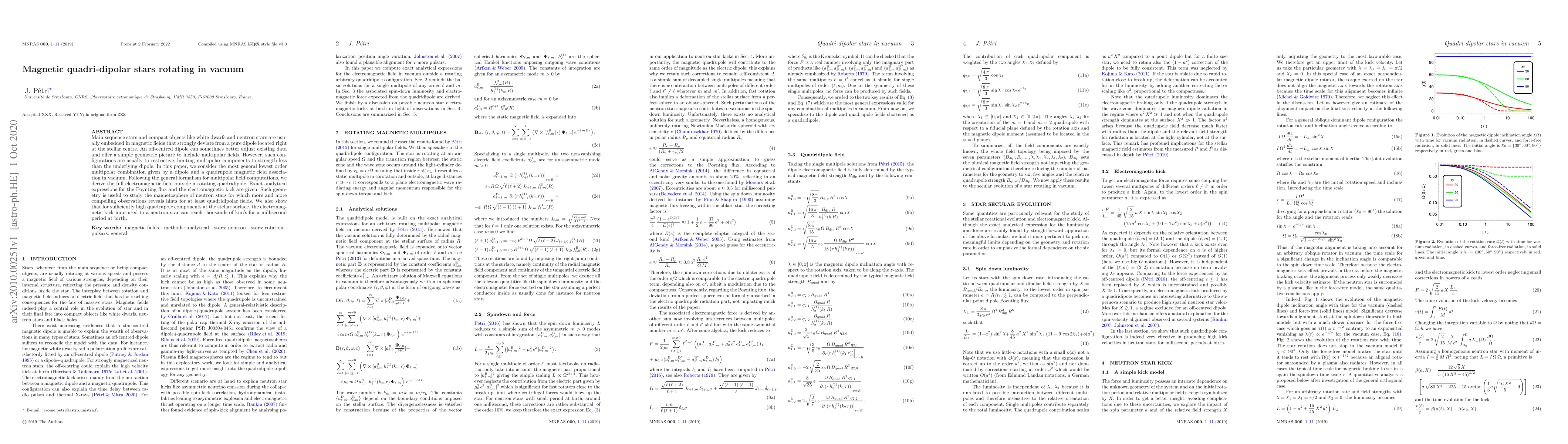 Main sequence stars and compact objects like white dwarfs and neutron stars are usually embedded in magnetic fields that strongly deviate from a pure dipole located right at the stellar centre. An off-centred dipole can sometimes better adjust existing data and offer a simple geometric picture to include multipolar fields. However, such configurations are usually to restrictive, limiting multipolar components to strength less than the underlying dipole. In this paper, we consider the most general lowest order multipolar combination given by a dipole and a quadrupole magnetic field association in vacuum. Following the general formalism for multipolar field computations, we derive the full electromagnetic field outside a rotating quadridipole. Exact analytical expressions for the Poynting flux and the electromagnetic kick are given. Such geometry is useful to study the magnetosphere of neutron stars for which more and more compelling observations reveals hints for at least quadridipolar fields. We also show that for sufficiently high quadrupole components at the stellar surface, the electromagnetic kick imprinted to a neutron star can reach thousands of km/s for a millisecond period at birth.