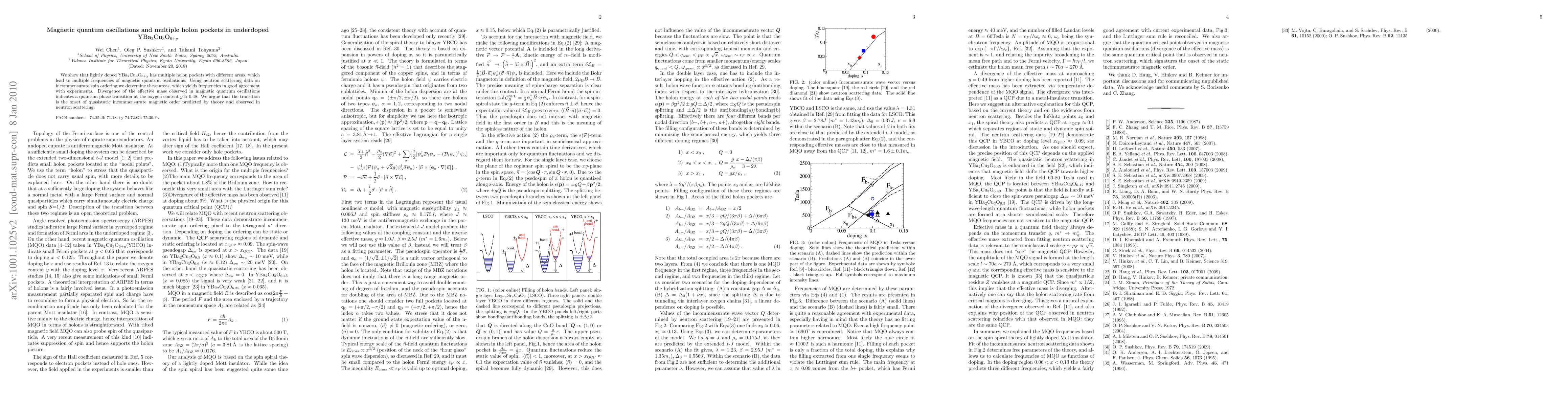 We show that lightly doped YBa$_2$Cu$_3$O$_{6+y}$ has multiple holon pockets with different areas, which lead to multiple frequencies of magnetic quantum oscillations. Using neutron scattering data on incommensurate spin ordering we determine these areas, which yields frequencies in good agreement with experiments. Divergence of the effective mass observed in magnetic quantum oscillations indicates a quantum phase transition at the oxygen content $y\approx 0.48$. We argue that the transition is the onset of quasistatic incommensurate magnetic order predicted by theory and observed in neutron scattering.