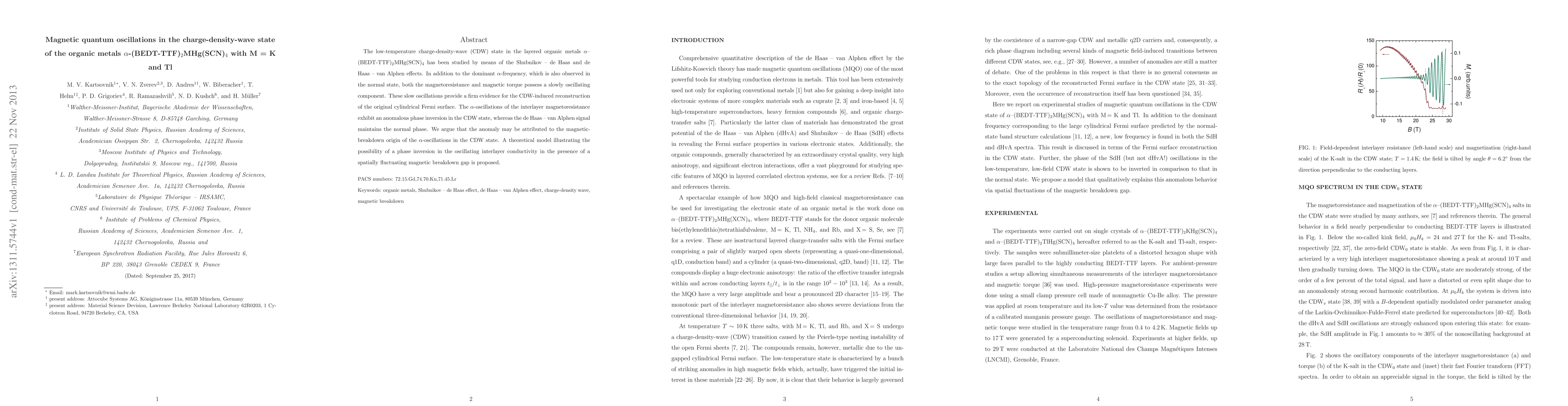 The low-temperature charge-density-wave (CDW) state in the layered organic metals $\alpha $-(BEDT-TTF)$_2$MHg(SCN)$_4$ has been studied by means of the Shubnikov -- de Haas and de Haas -- van Alphen effects. In addition to the dominant alpha-frequency, which is also observed in the normal state, both the magnetoresistance and magnetic torque possess a slowly oscillating component. These slow oscillations provide a firm evidence for the CDW-induced reconstruction of the original cylindrical Fermi surface. The alpha-oscillations of the interlayer magnetoresistance exhibit an anomalous phase inversion in the CDW state, whereas the de Haas -- van Alphen signal maintains the normal phase. We argue that the anomaly may be attributed to the magnetic-breakdown origin of the alpha-oscillations in the CDW state. A theoretical model illustrating the possibility of a phase inversion in the oscillating interlayer conductivity in the presence of a spatially fluctuating magnetic breakdown gap is proposed.