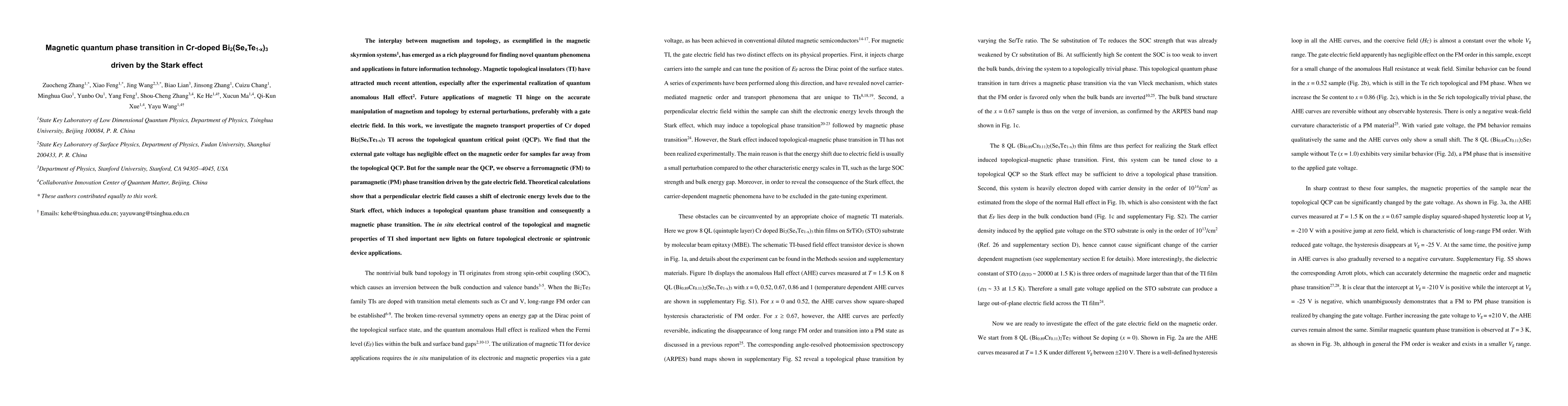 The interplay between magnetism and topology, as exemplified in the magnetic skyrmion systems, has emerged as a rich playground for finding novel quantum phenomena and applications in future information technology. Magnetic topological insulators (TI) have attracted much recent attention, especially after the experimental realization of quantum anomalous Hall effect. Future applications of magnetic TI hinge on the accurate manipulation of magnetism and topology by external perturbations, preferably with a gate electric field. In this work, we investigate the magneto transport properties of Cr doped Bi2(SexTe1-x)3 TI across the topological quantum critical point (QCP). We find that the external gate voltage has negligible effect on the magnetic order for samples far away from the topological QCP. But for the sample near the QCP, we observe a ferromagnetic (FM) to paramagnetic (PM) phase transition driven by the gate electric field. Theoretical calculations show that a perpendicular electric field causes a shift of electronic energy levels due to the Stark effect, which induces a topological quantum phase transition and consequently a magnetic phase transition. The in situ electrical control of the topological and magnetic properties of TI shed important new lights on future topological electronic or spintronic device applications.