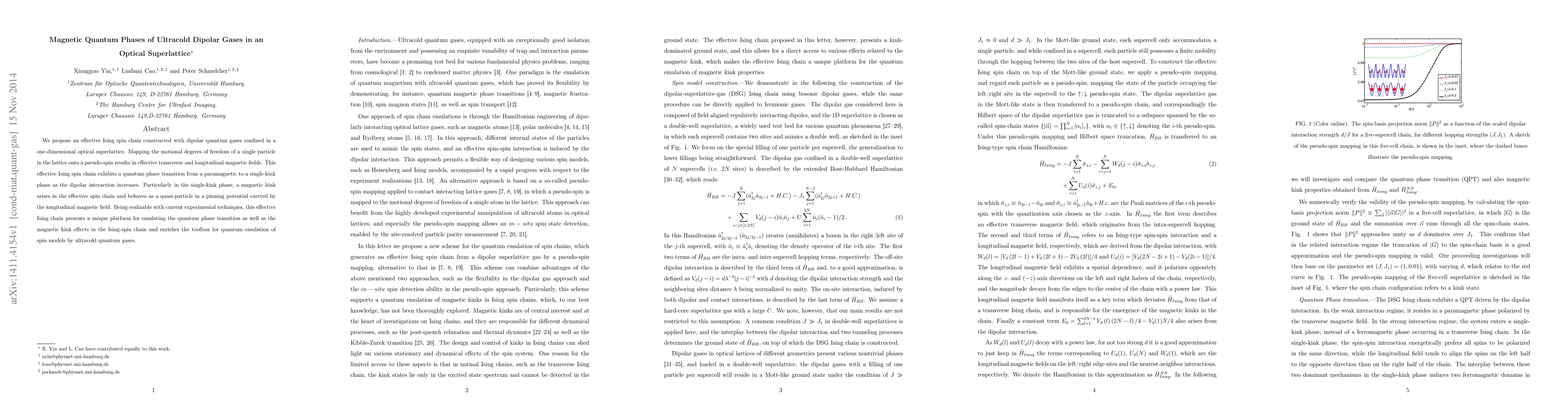 The paper presents a theoretical framework for constructing an effective Ising spin chain using dipolar quantum gases in an optical superlattice, demonstrating a quantum phase transition and magnetic kink behavior.