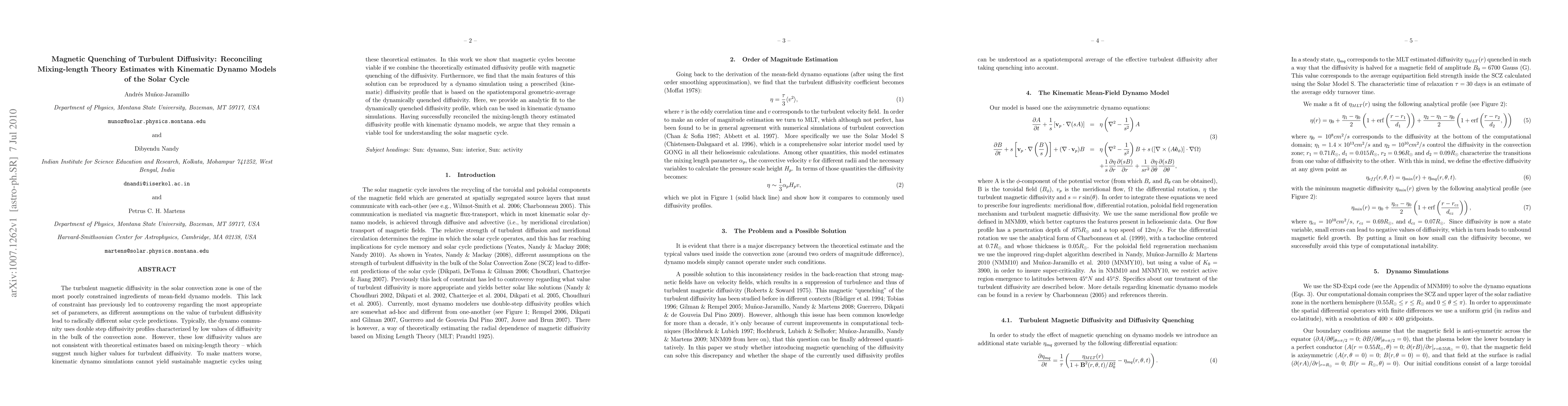 This paper reconciles the discrepancy between mixing-length theory estimates and kinematic dynamo models of the solar cycle by introducing magnetic quenching of turbulent diffusivity. It demonstrates that combining theoretical diffusivity profiles with magnetic quenching allows for viable magnetic cycles, providing an analytic fit for use in kinematic dynamo simulations.