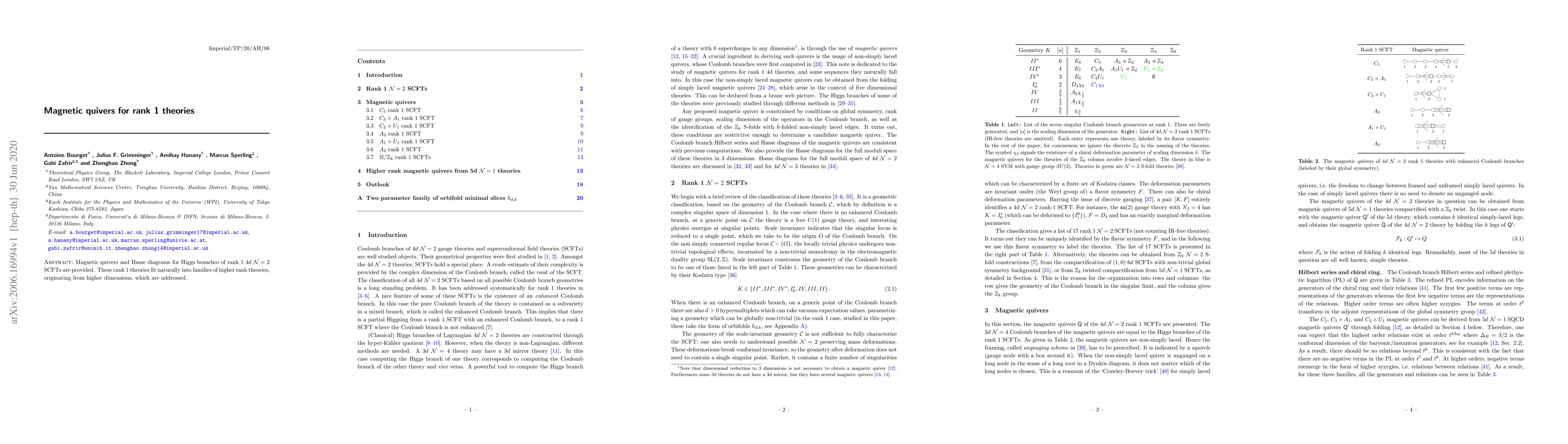 Magnetic quivers and Hasse diagrams for Higgs branches of rank 1 $4d$ $\mathcal{N}=2$ SCFTs are provided. These rank 1 theories fit naturally into families of higher rank theories, originating from higher dimensions, which are addressed.